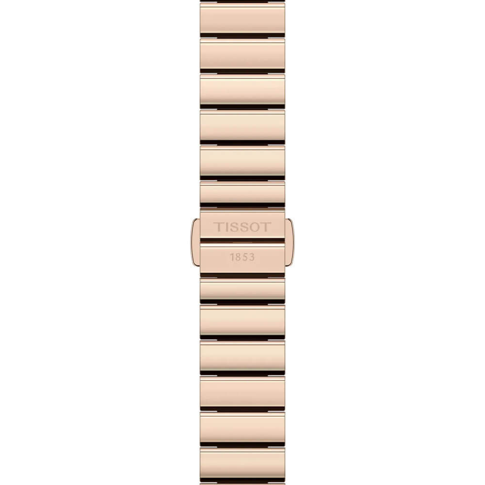 Koperta w rozmiarze 21.80 mm oraz bransoleta zostały wykonane ze stali szlachetnej i pokryte złotą powłoką PVD, co gwarantuje trwałość i elegancki połysk przez lata. Niebieska tarcza z efektem promieni słonecznych tworzy wyrazisty kontrast z diamentowymi indeksami, a całość dopełnia szwajcarski mechanizm wyposażony we wskaźnik End Of Life, przypominający o konieczności wymiany baterii. Prostokątny zegarek Tissot Diamonds T160.110.33.046.00 na bransolecie to propozycja, która w równym stopniu stawia na estetykę i niezawodność.