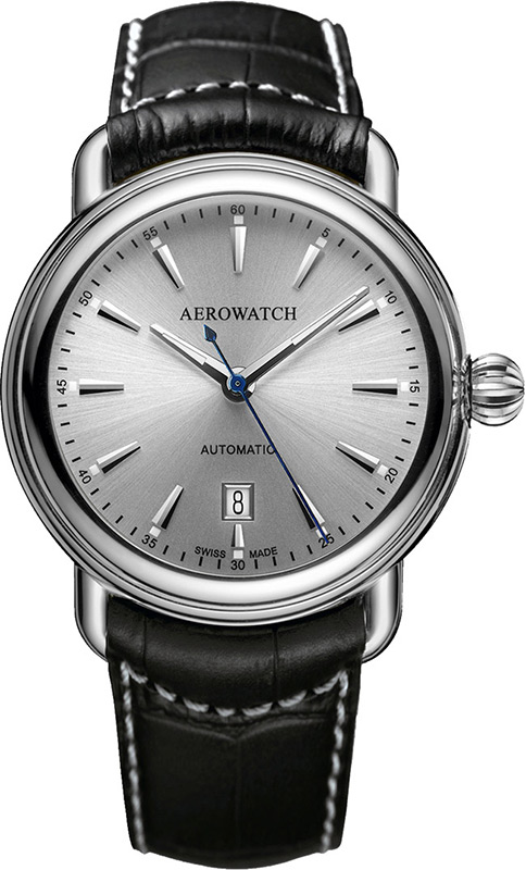 Aerowatch 1942 Automatic A 60900 AA19 to bez wątpienia jeden z piękniejszych, klasycznych zegarków szwajcarskich. Wyraźne polerowane indeksy graniastosłupowe, retro wzornictwo, wysokiej jakości mechanizm automatyczny i wyczucie dobrego smaku powodują, że jest to idealna propozycja dla współczesnego mężczyzny ceniącego sobie komfort, elegancję, jak i wartości szwajcarskiego zegarmistrzostwa. Stalowa koperta o średnicy 40 mm posiada zaokrąglone uszy do mocowania paska, które były stosowane w zegarkach produkowanych w latach 40. Koronka do ustawiania czasu również nawiązuje kształtem do klasycznego stylu, zaokrąglona, wygodna w uchwycie, zdobiona charakterystycznymi rowkami.