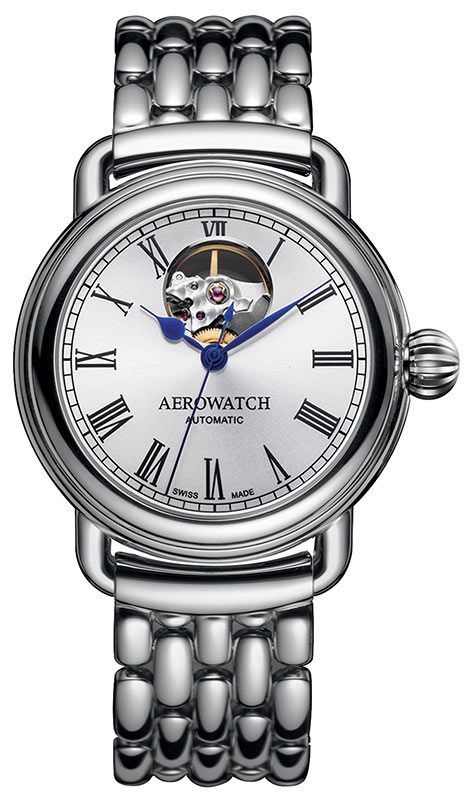 Aerowatch 1942 Gent Automatic Heart Beat A 68900 AA03 M to bez wątpienia jeden z piękniejszych, klasycznych zegarków szwajcarskich. Wyraźne rzymskie indeksy i retro wzornictwo. Na godzinie 12 Aerowatch umieścił małe okienko, które ukazuje pracę balansu. Pięknie zdobiona część mechanizmu w sposób hipnotyczny ukazuje zwijanie i rozwijanie sprężyny balansowej. Wysokiej jakości mechanizm automatyczny i wyczucie dobrego smaku powodują, że jest to idealna propozycja dla współczesnego mężczyzny ceniącego sobie komfort, elegancję, jak i wartości szwajcarskiego zegarmistrzostwa. Stalowa koperta o średnicy 40 mm posiada zaokrąglone uszy do mocowania paska, które były stosowane w zegarkach produkowanych w latach 40. Koronka do ustawiania czasu również nawiązuje kształtem do klasycznego stylu, zaokrąglona, wygodna w uchwycie, zdobiona charakterystycznymi rowkami.