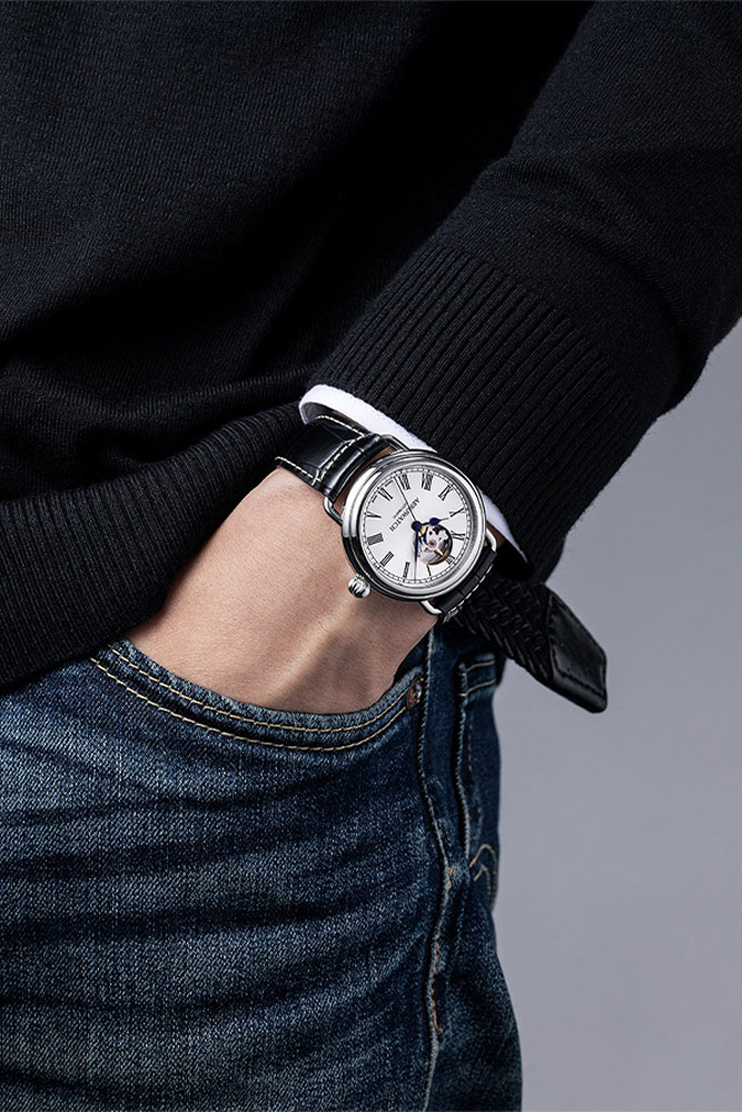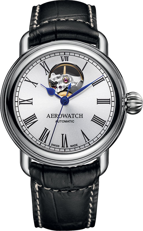 Aerowatch 1942 Gent Automatic Heart Beat A 68900 AA03 to bez wątpienia jeden z piękniejszych, klasycznych zegarków szwajcarskich. Wyraźne rzymskie indeksy i retro wzornictwo. Na godzinie 12 Aerowatch umieścił małe okienko, które ukazuje pracę balansu. Pięknie zdobiona część mechanizmu w sposób hipnotyczny ukazuje zwijanie i rozwijanie sprężyny balansowej. Wysokiej jakości mechanizm automatyczny i wyczucie dobrego smaku powodują, że jest to idealna propozycja dla współczesnego mężczyzny ceniącego sobie komfort, elegancję, jak i wartości szwajcarskiego zegarmistrzostwa. Stalowa koperta o średnicy 40 mm posiada zaokrąglone uszy do mocowania paska, które były stosowane w zegarkach produkowanych w latach 40. Koronka do ustawiania czasu również nawiązuje kształtem do klasycznego stylu, zaokrąglona, wygodna w uchwycie, zdobiona charakterystycznymi rowkami.