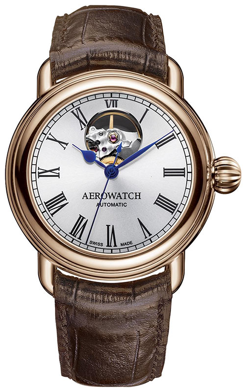 Aerowatch 1942 Gent Automatic Heart Beat A 68900 RO03 to bez wątpienia jeden z piękniejszych, klasycznych zegarków szwajcarskich. Wyraźne rzymskie indeksy i retro wzornictwo. Na godzinie 12 Aerowatch umieścił małe okienko, które ukazuje pracę balansu. Pięknie zdobiona część mechanizmu w sposób hipnotyczny ukazuje zwijanie i rozwijanie sprężyny balansowej. Wysokiej jakości mechanizm automatyczny i wyczucie dobrego smaku powodują, że jest to idealna propozycja dla współczesnego mężczyzny ceniącego sobie komfort, elegancję, jak i wartości szwajcarskiego zegarmistrzostwa. Stalowa koperta o średnicy 40 mm, złocona różowym złotem PVD, posiada zaokrąglone uszy do mocowania paska, które były stosowane w zegarkach produkowanych w latach 40. Koronka do ustawiania czasu również nawiązuje kształtem do klasycznego stylu, zaokrąglona, wygodna w uchwycie, zdobiona charakterystycznymi rowkami.