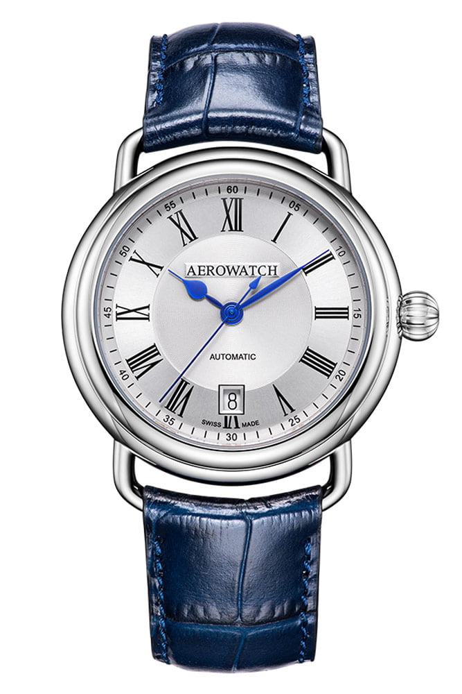 Aerowatch 1942 Automatic A 60900 AA26 to bez wątpienia jeden z piękniejszych, klasycznych zegarków szwajcarskich. Retro wzornictwo, wysokiej jakości mechanizm automatyczny i wyczucie dobrego smaku powodują, że jest to idealna propozycja dla współczesnego mężczyzny ceniącego sobie komfort, elegancję, jak i wartości szwajcarskiego zegarmistrzostwa. Stalowa koperta o średnicy 40 mm posiada zaokrąglone uszy do mocowania w tym modelu niebieskiego paska ze skóry. Koronka do ustawiania czasu również nawiązuje kształtem do klasycznego stylu, zaokrąglona, wygodna w uchwycie, zdobiona charakterystycznymi rowkami. Pod twardym trudnym do zarysowania szkłem szafirowym znajduje się jasny cyferblat. Na cyferblacie znajdziemy eleganckie niebieskie wskazówki, cyfry rzymskie oraz mały datownik na godzinie szóstej.