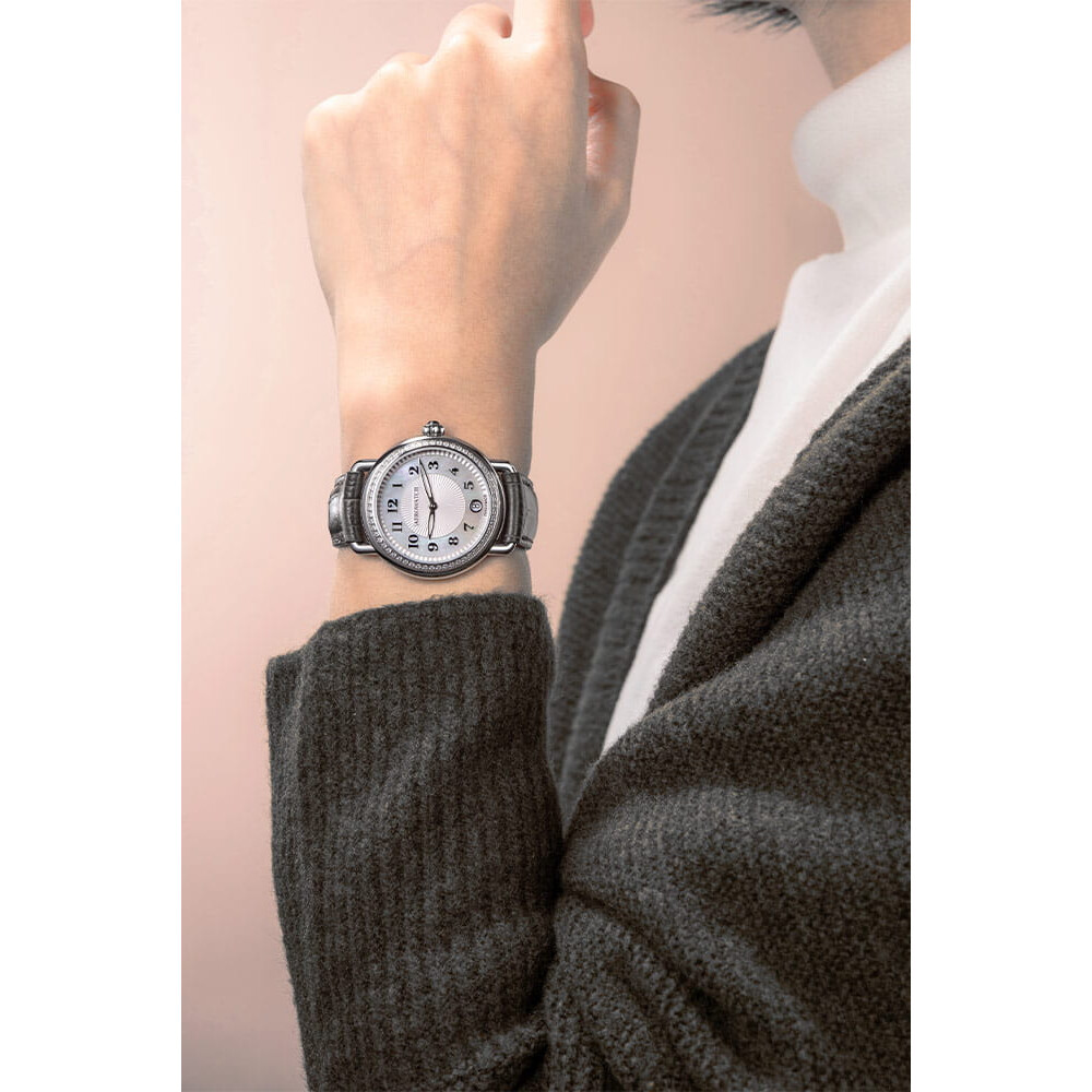 Damski czasomierz Aerowatch o numerze referencji A 42960 AA19 DIA to okrągła obudowa o średnicy 35 mm. Na froncie naniesiono przepiękny dodatek w postaci aż 58 diamentów 0.41 ct. Mówi się, że diamenty są najlepszymi przyjaciółmi kobiety. Wykorzystane kamienie szlachetne mają swoją ciekawą historie bowiem stworzone zostały przez człowieka w laboratorium. Diamenty laboratoryjne nazywane są również diamentami syntetycznymi. Diamenty syntetyczne to przyjazny zamiennik tych kopalnianych i są "hodowane" przez człowieka sposobem, który leży u podstaw formowania diamentów kopalnianych. Warto zaznaczyć, że diamenty syntetyczne nie różnią się od tych tradycyjnych. Szkło szafirowe niezwykle trudne do zarysowania chroni perłowy cyferblat. Cyferblat z giloszowym środkiem wyposażony został w datownik na godzinie szóstej. Datownik wskazuje aktualny dzień miesiąca. Aktualną godzinę odczytamy dzięki szkieletowym wskazówkom i cyfrom arabskim. Do uszu koperty przymocowany został pasek skórzany w kolorze szarym z klasycznym zapięciem na sprzączkę.