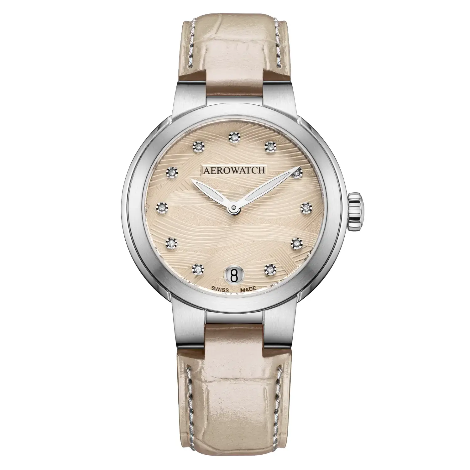 Wypukłe szkło szafirowe z powłoką antyrefleksyjną eksponuje trójwymiarową fakturę tarczy i chroni ją przed codziennymi zarysowaniami. Skórzany pasek w kremowym kolorze został starannie dobrany pod względem tonu i faktury, tworząc spójną całość z tarczą. Delikatne przeszycia i stalowa klamerka podkreślają dbałość o detale i zapewniają wygodę noszenia. Na godzinie 6 umieszczono dyskretny datownik, który zwiększa funkcjonalność zegarka bez zaburzania jego harmonii. Aerowatch Harmonie A 42107 AA02 to wyrafinowana propozycja dla kobiet, które cenią subtelny luksus i ponadczasową estetykę.