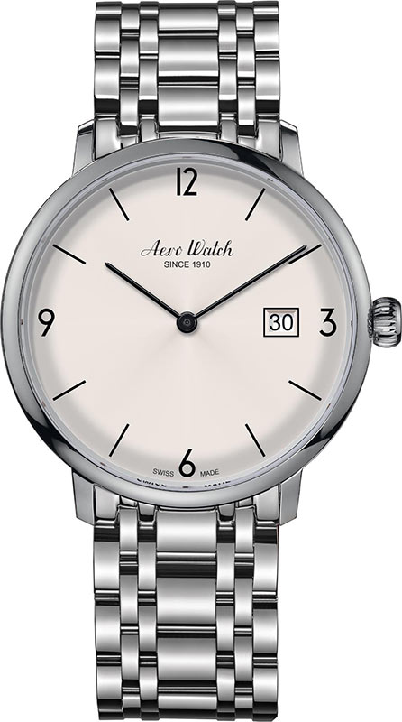 Klasyczny zegarek męski Aerowatch Heritage Slim Quartz A 21976 AA08 M, który idealnie komponuje się z elegancką koszulą i garniturem. Smukła koperta o średnicy 40 mm jest wykonana ze stali nierdzewnej. Lekko zakrzywiona konstrukcja wygodnie opiera się na nadgarstku i bezproblemowo chowa pod mankietem koszuli, nie hacząc o nią i nie niszcząc jej. Mimo swoich niedużych wymiarów zegarek wcale nie wydaje się mały. Pięknie zdobiona tarcza w kolorze białym z czarnymi indeksami jest lekko wygięta i otoczona wąskim, polerowanym pierścieniem, który optycznie potęguje wielkość cyferblatu. Zdobiona koronka na godzinie trzeciej służy do regulacji, ustawiania czasu. Aerowatch Heritage Slim ma lekko wypukłe, odporne na zarysowania szkło szafirowe. Wewnątrz zegarka znajduje się dokładny mechanizm kwarcowy na baterię.