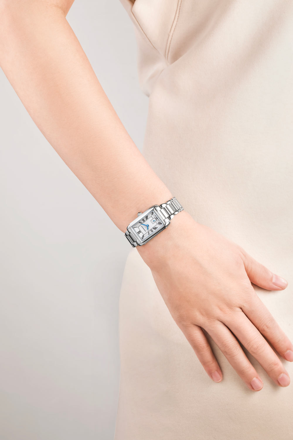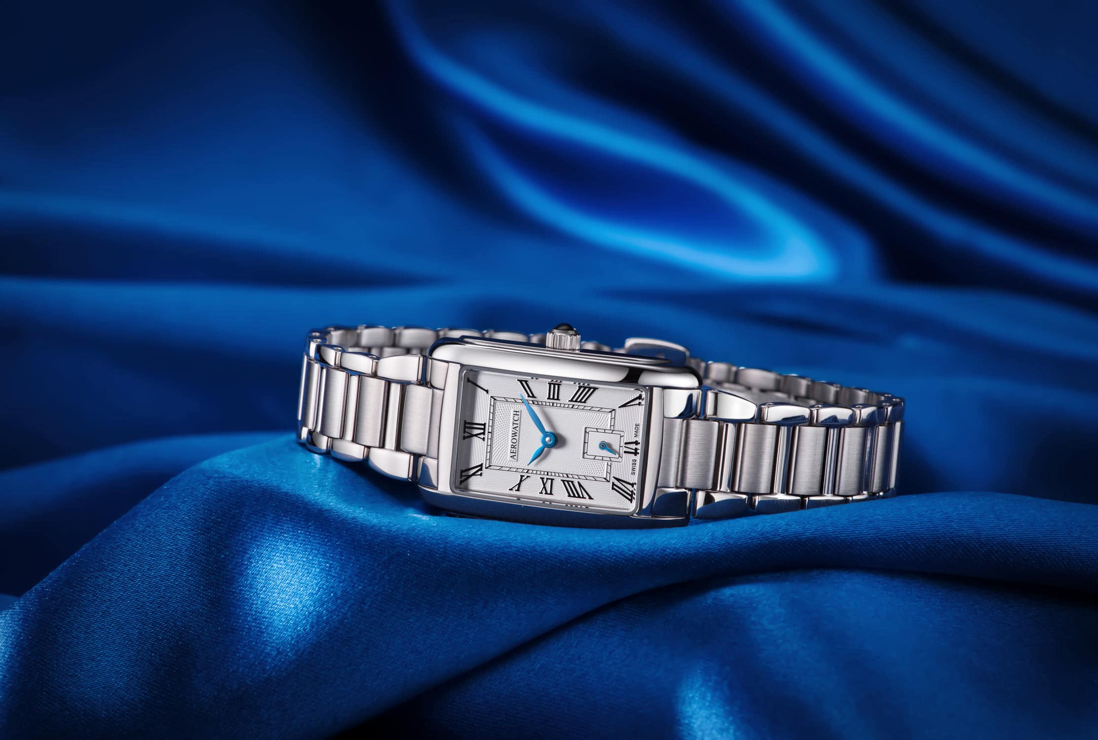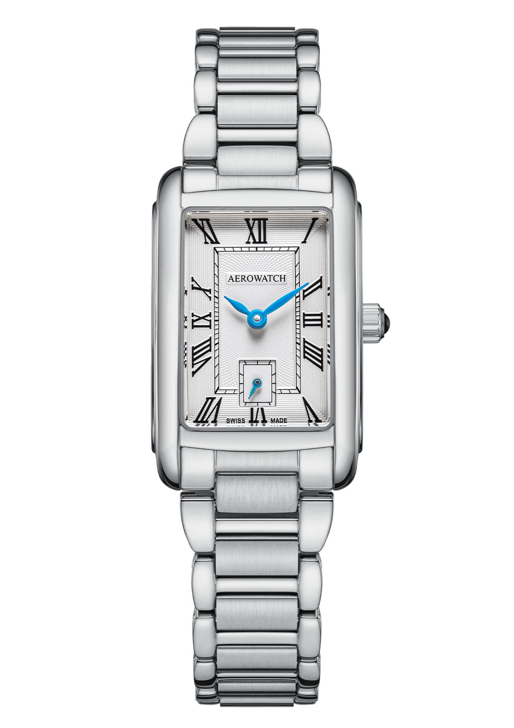 Szwajcarski zegarek damski Aerowatch Mini Intuition Lady A 31104 AA01 M to kwintesencja elegancji zamknięta w prostokątnej kopercie ze szlachetnej stali, która podkreśla jego klasyczny, ale jednocześnie nowoczesny styl. Srebrny cyferblat zegarka to aura wyrafinowania, a eleganckie, rzymskie indeksy nadają jej wyjątkowej klasy. Niezwykle efektowne niebieskie wskazówki pięknie kontrastują z całością. Model ten zawieszony jest na trzyrzędowej bransolecie ze stali. Wszystko to tworzy perfekcyjnie zbalansowaną i harmonijną kompozycję, która przyciąga spojrzenia.