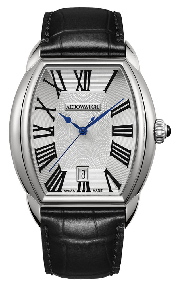 Zegarek w stylu retro Aerowatch o numerze referencji A42958AA05 to obudowa w kształcie tonneau wykonana ze stali szlachetnej w rozmiarze 35 mm x 37 mm. Koperta tonneau przypomina beczkę i z pewnością wyróżni się na każdym nadgarstku. Do uszu koperty przymocowany został elegancki pasek skórzany w kolorze czarnym. Szkło szafirowe niezwykle trudne do zarysowania chroni srebrny giloszowy cyferblat. Cyferblat wyposażony został w datownik na godzinie szóstej. Małe okienko datownika wskazuje aktualny dzień miesiąca. Aktualną godzinę odczytamy dzięki eleganckim niebieskim wskazówkom typu "spade" oraz cyfrom rzymskim. Na prawej stronie koperty znalazła się wygodna w obsłudze koronka ozdobiona ciemnym kamieniem. Szwajcarska marka Aerowatch zadbała o pełną funkcjonalność i komfort użytkowania.