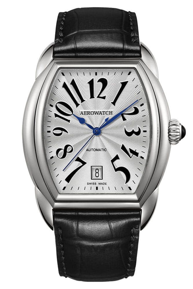 Zegarek męski w stylu retro Aerowatch o numerze referencji A 60959 AA06 to obudowa w kształcie tonneau wykonana ze stali szlachetnej w rozmiarze 39 mm x 37.5 mm. Koperta tonneau przypomina beczkę i z pewnością wyróżni się na każdym męskim nadgarstku. Do uszu obudowy przymocowany został elegancki pasek skórzany w kolorze czarnym. Szkło szafirowe niezwykle trudne do zarysowania chroni srebrny giloszowy cyferblat. Cyferblat wyposażony został w datownik na godzinie szóstej. Małe okienko datownika wskazuje nam aktualny dzień miesiąca. Aktualną godzinę odczytamy dzięki eleganckim niebieskim wskazówkom typu "spade" oraz cyfrom arabskim. Na prawej stronie koperty znalazła się duża wygodna w obsłudze koronka ozdobiona ciemnym kamieniem. Szwajcarska marka Aerowatch zadbała o pełną funkcjonalność i komfort użytkowania.