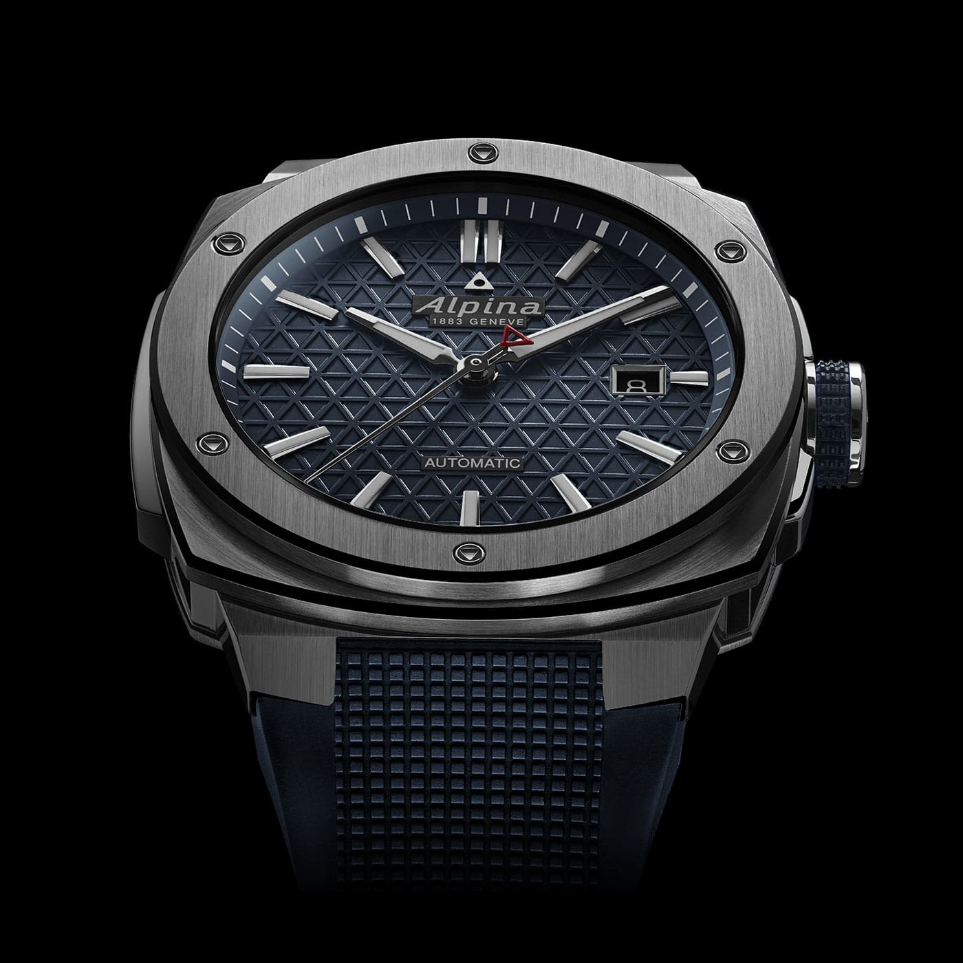 Wokół ramki koperty obecnych jest sześć śrub o przekroju trójkątnym w odniesieniu do logo Alpina oraz estetyczna figura niezmienna od 2009 roku. Zintegrowany pasek (bez łącznika z pokrowcem), wykonano z teksturowanej gumy — to znana cecha, lecz ponownie poddana sprawdzeniu, aby zapewnić tyle samo komfortu, co siły i nowoczesności. W różnych punktach solidnej obudowy znajduje się środkowe wzmocnienie (na godzinie 9) oraz osłona koronki (na godzinie 3). Koronka nadal ma gumowy uchwyt, tak ceniony za swoją skuteczność w łatwej obsłudze gołymi rękami lub w rękawiczkach. Zarówno koronka, jak i dekiel są zakręcane, aby zagwarantować wodoszczelność przy 20 ATM/200 metrach.