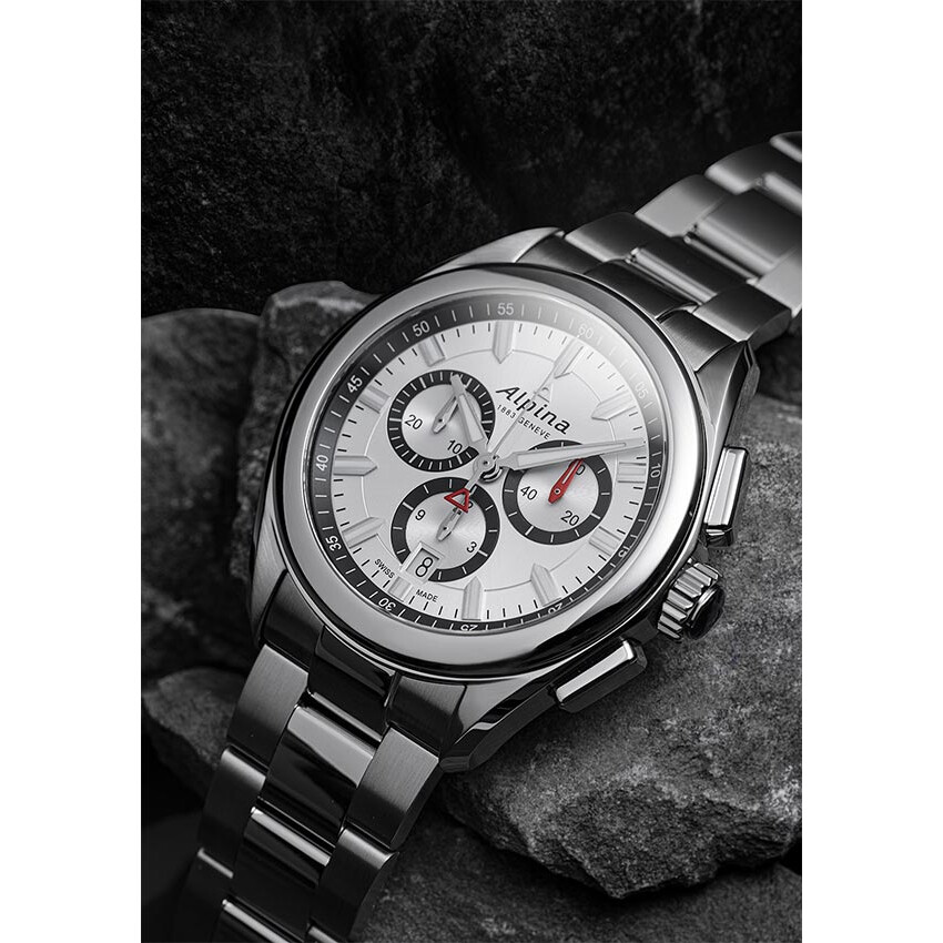 Zegarek z kolekcji Alpiner Quartz Chronograph to innowacyjna oferta podążająca ścieżką legendarnego Alpinera4 zaprezentowanego w 1938 roku, posiadającego cztery, kultowe cechy. Antymagnetyzm, odporność na wstrząsy, wodoodporność i obudowę ze stali nierdzewnej. Alpiner4 powstał, aby spełniać rolę idealnego towarzysza dla poszukiwaczy naturalnych wyzwań. Podbudowany tym dziedzictwem, model Alpiner Quartz Chronograph jest wyposażony w pokaźną kopertę ze stali szlachetnej o średnicy 42 mm, podświetlane wskazówki oraz w licznik sekund na godzinie 3. Czerwona, ożywiająca barwa natomiast stylowo podkreśla przeciwwagę wskazówki sekundowej i słynny trójkąt, będący symbolem alpejskich szczytów.