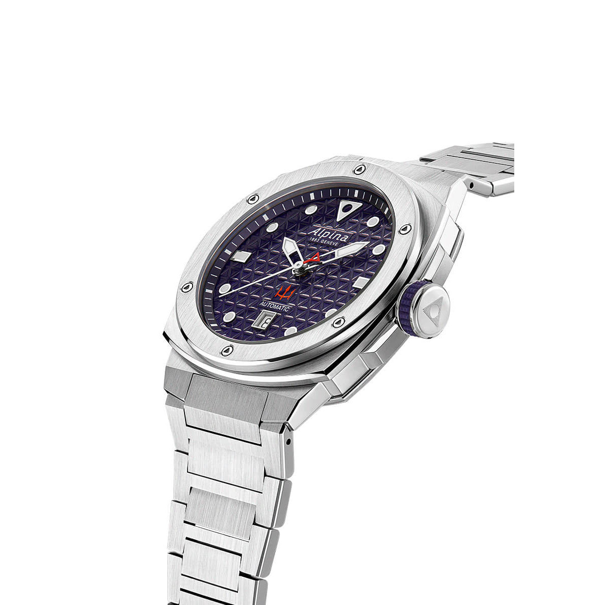 Na pierwszy rzut oka uwagę przyciąga ciemnoniebieska tarcza, której trójwymiarowa faktura zachwyca swoją głębią i szczegółami. To właśnie detale – takie jak luminescencyjne wskazówki i indeksy, czy subtelny datownik umieszczony na godzinie 3 – sprawiają, że zegarek prezentuje się równie dobrze w świetle dziennym, jak i w ciemnościach. Koperta tonneau o beczkowatym kształcie, wykonana z wytrzymałej stali nierdzewnej, ma wymiary 41 × 42.50 mm, dzięki czemu jest idealnie dopasowana do codziennego użytkowania. Czasomierz Alpina nie tylko świetnie sprawdzi się w miejskiej scenerii, ale także w ekstremalnych warunkach. Jego elegancka, a zarazem sportowa stylistyka pozwala nosić go z dumą niezależnie od okazji.