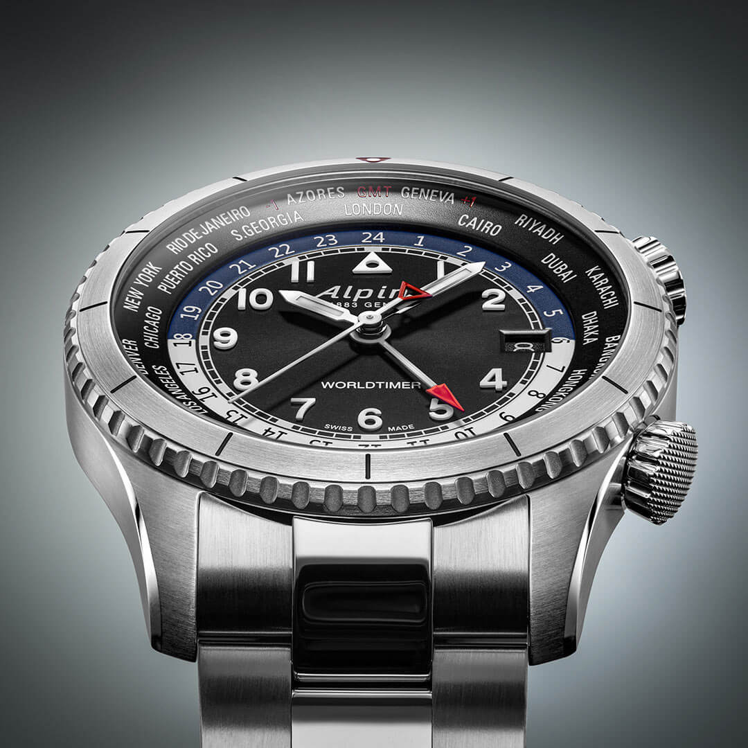 Czarny cyferblat czasomierza Alpina Startimer Pilot Worldtimer to dzieło sztuki użytkowej. Umieszczono na nim pierścień z nazwami miast reprezentujących różne strefy czasowe, co pozwala na szybkie odczytanie czasu na całym świecie. Dwie dodatkowe koronki, zlokalizowane po prawej stronie koperty, umożliwiają precyzyjne ustawienie skali stref czasowych. Centralną część tarczy zdobią tradycyjne wskazówki godzinowa i minutowa oraz dodatkowa wskazówka GMT z czerwonym grotem, która wskazuje czas w drugiej strefie czasowej. Wysoka czytelność cyferblatu została osiągnięta dzięki kontrastującym detalom i dodatkowym elementom, takim jak wskaźnik dnia i nocy czy datownik umieszczony na godzinie trzeciej.