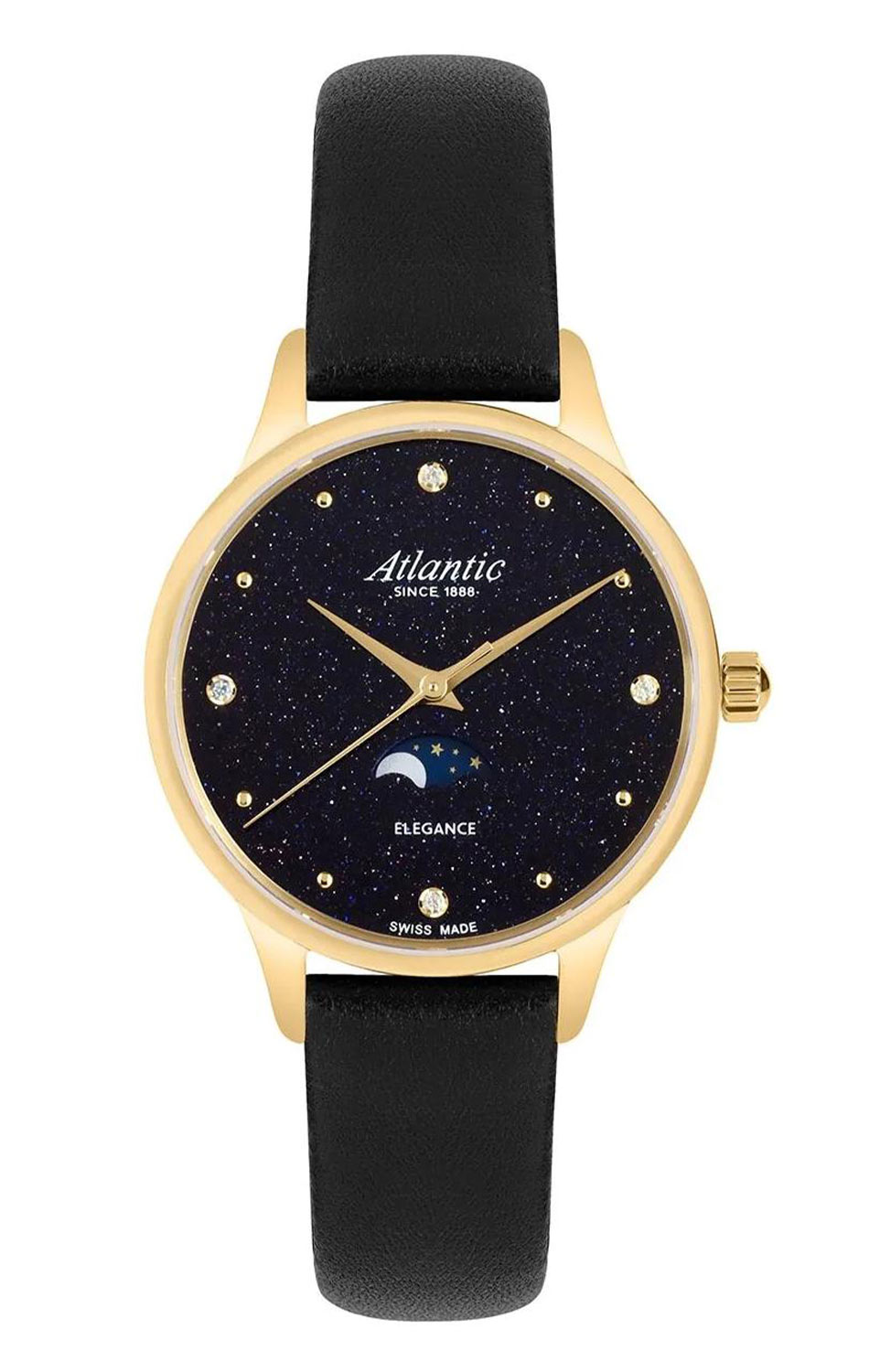Pozłacany zegarek damski Atlantic Elegance Aventurine 30230.45.59L to model stworzony z myślą o kobietach, które cenią wyrafinowane dodatki i lubią, gdy biżuteria łączy się z funkcjonalnością. Smukła forma, połyskujące detale i subtelna komplikacja faz księżyca sprawiają, że ten model świetnie odnajduje się zarówno w eleganckich stylizacjach, jak i jako codzienny akcent w bardziej minimalistycznym wydaniu.
