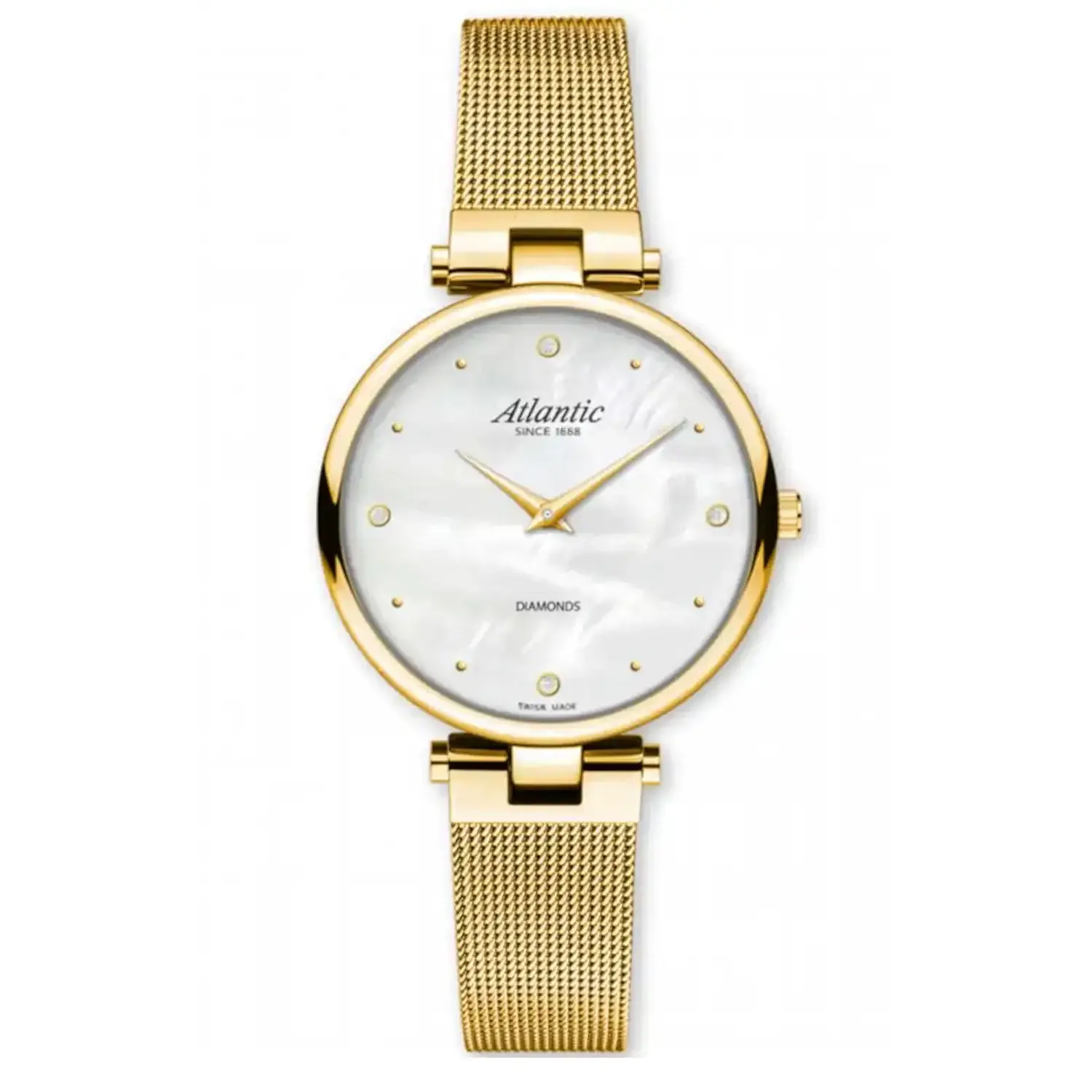 Tarcza z masy perłowej hipnotyzuje subtelną grą kolorów i organicznym refleksem, typowym dla naturalnego materiału. Cztery prawdziwe diamenty zastępują klasyczne indeksy, dodając kompozycji blasku i wyjątkowości. Wewnątrz koperty pracuje szwajcarski mechanizm kwarcowy Ronda – gwarancja niezawodności i dokładnej pracy. Pozłacany zegarek damski Atlantic 29044.45.07GMB na bransolecie to nie tylko czasomierz – to przemyślana kompozycja formy, światła i detalu, która sprawdzi się jako osobisty manifest stylu każdej eleganckiej kobiety.