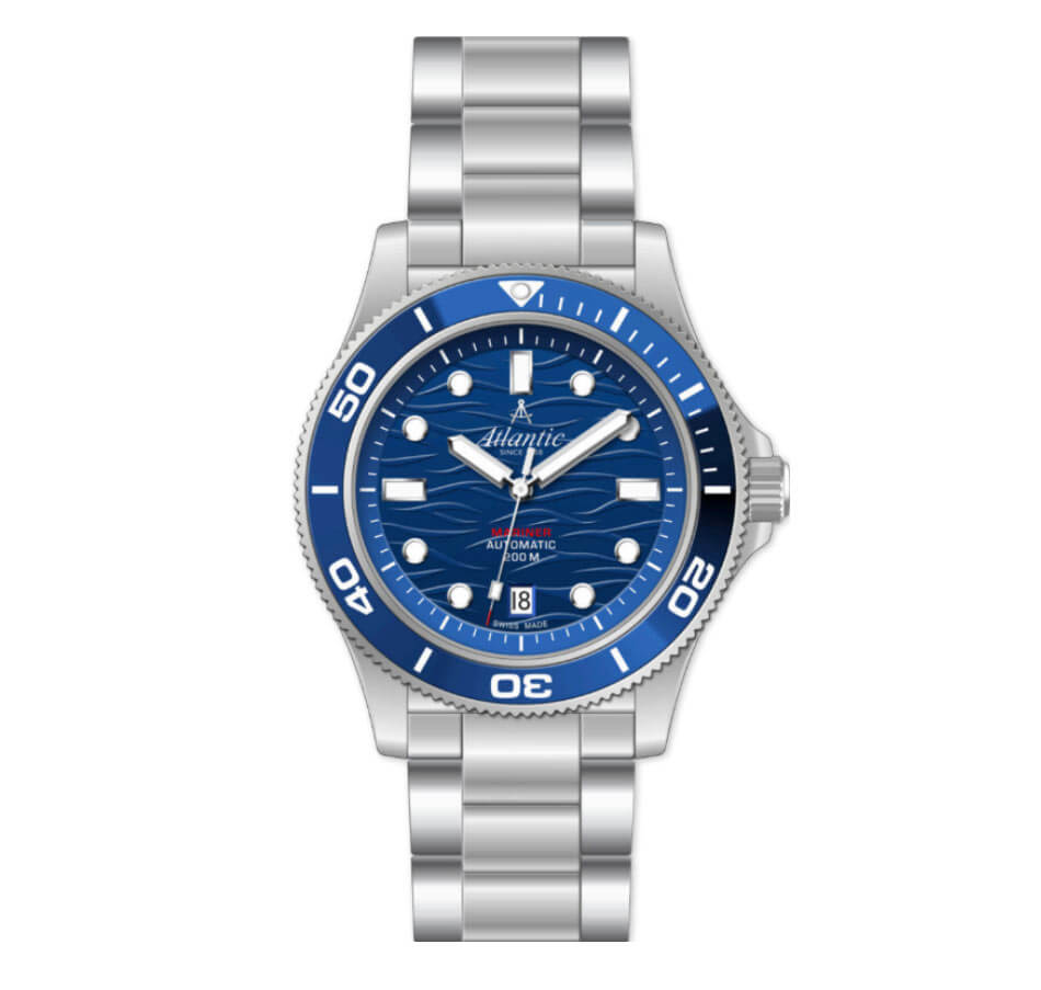 Tarcza w kolorze niebieskim została ozdobiona charakterystycznym wzorem przypominającym fale, co nadaje jej dynamiczny, głęboki wygląd i podkreśla morski rodowód tego modelu. Grube indeksy i masywne wskazówki wypełnione masą luminescencyjną zapewniają czytelność nawet w ciemnych warunkach. Wewnątrz pracuje szwajcarski mechanizm automatyczny Sellita SW200-1 — werk znany z niezawodności, precyzji i trwałości. Nurkowy zegarek automatyczny Atlantic 81776.41.59 to propozycja dla mężczyzny, który potrzebuje czegoś więcej niż stylowej ozdoby — to prawdziwy instrument czasu, gotowy na głębiny.