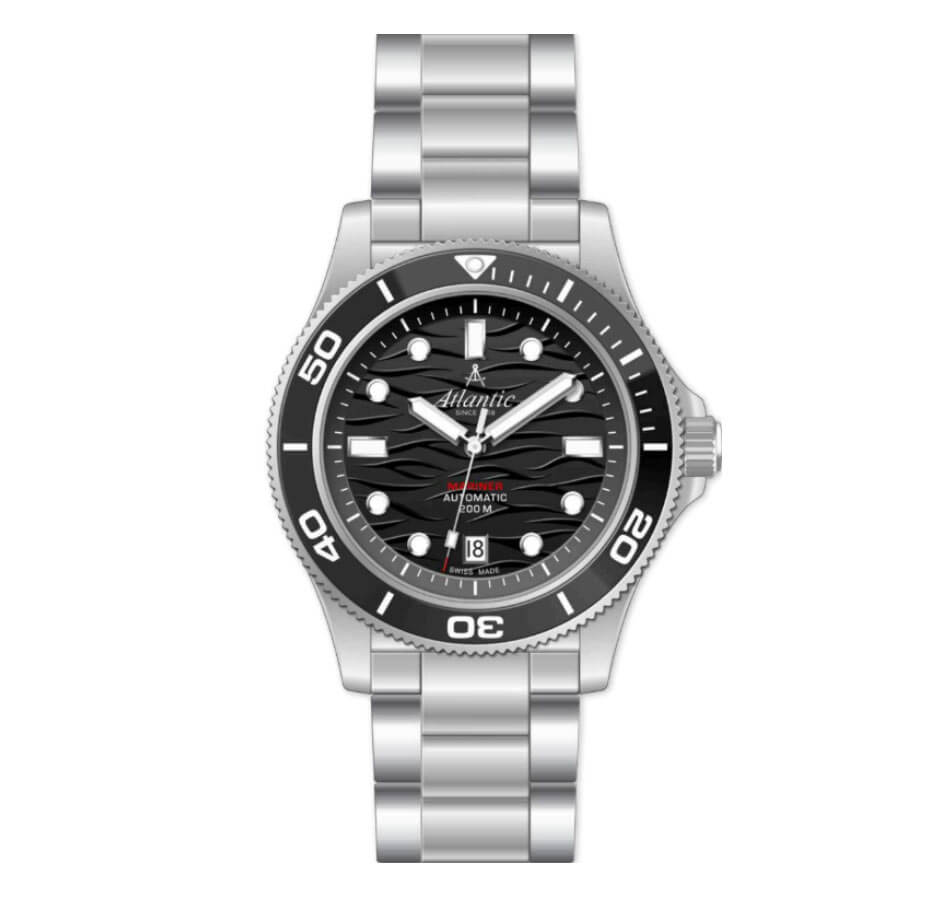Tarcza w kolorze czarnym została ozdobiona charakterystycznym wzorem przypominającym fale, co nadaje jej dynamiczny, głęboki wygląd i podkreśla morski rodowód tego modelu. Grube indeksy i masywne wskazówki wypełnione masą luminescencyjną zapewniają czytelność nawet w ciemnych warunkach. Wewnątrz pracuje szwajcarski mechanizm automatyczny Sellita SW200-1 — werk znany z niezawodności, precyzji i trwałości. Nurkowy zegarek automatyczny Atlantic 81776.41.69 to propozycja dla mężczyzny, który potrzebuje czegoś więcej niż stylowej ozdoby — to prawdziwy instrument czasu, gotowy na głębiny.