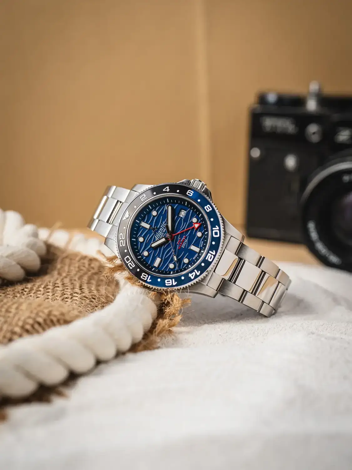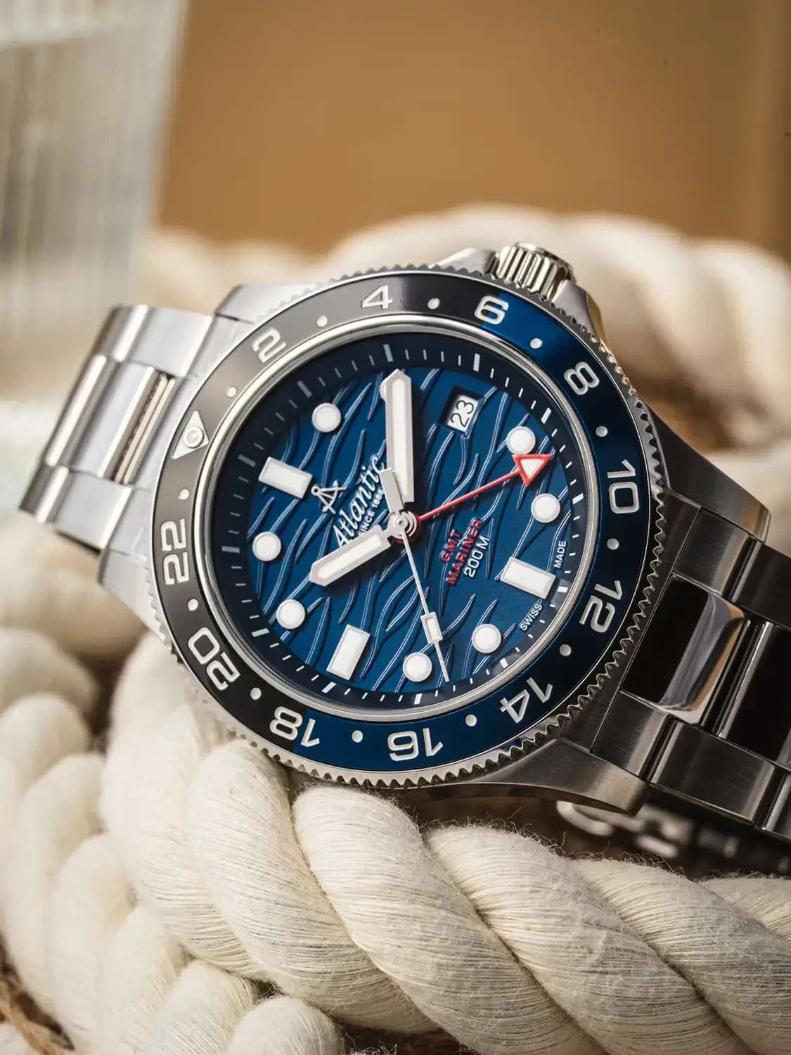 Tym, co wyróżnia Atlantic Mariner na tle innych diverów, jest tarcza – głęboko granatowa, ozdobiona subtelnym wzorem fal, który przywodzi na myśl spokojne, ale nieprzeniknione wody mórz i oceanów. Indeksy i wskazówki pokryto powłoką luminescencyjną, by zapewnić czytelność w mroku, a datownik na godzinie szóstej dyskretnie wpisuje się w kompozycję. To czasomierz dla tych, którzy nie boją się głębi – zarówno tej w wodzie, jak i w detalach. Zegarek z drugą strefą czasową Atlantic 81576.41.59GMT na bransolecie to doskonała propozycja dodatku dla nowoczesnego sportowca — model ten dotrzyma kroku swojemu właścicielowi w każdych warunkach.