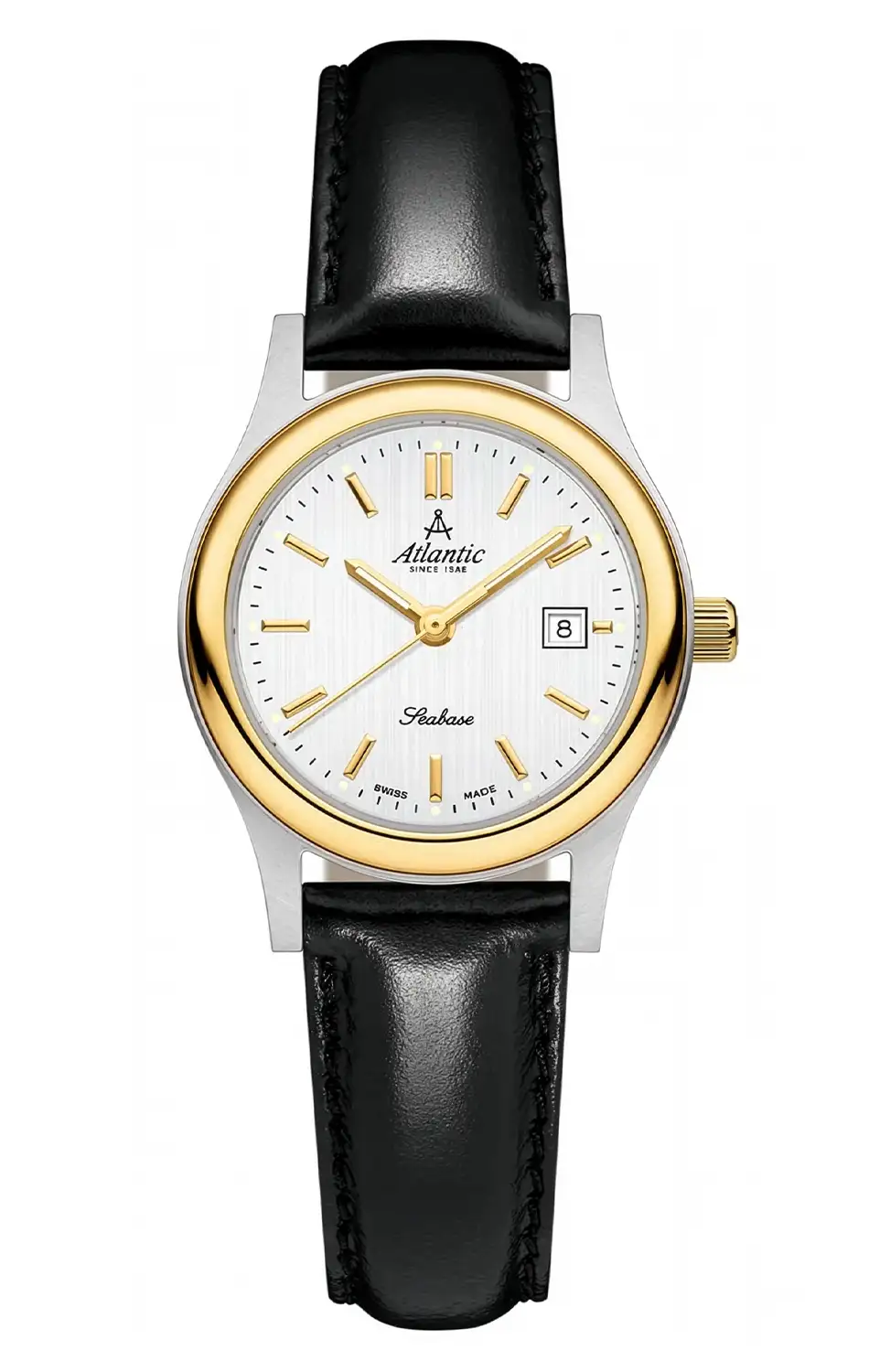 Zegarek damski Atlantic Seabase 20343.43.21 to klasyczny model w kompaktowym rozmiarze 27 mm, zaprojektowany z myślą o kobietach ceniących subtelną elegancję i ponadczasową formę. Dwukolorowa koperta Atlantic ze stali szlachetnej z pozłacaną ramką efektownie kontrastuje z czarnym, skórzanym paskiem, tworząc spójną i uniwersalną całość — idealną zarówno na co dzień, jak i do bardziej formalnych stylizacji.