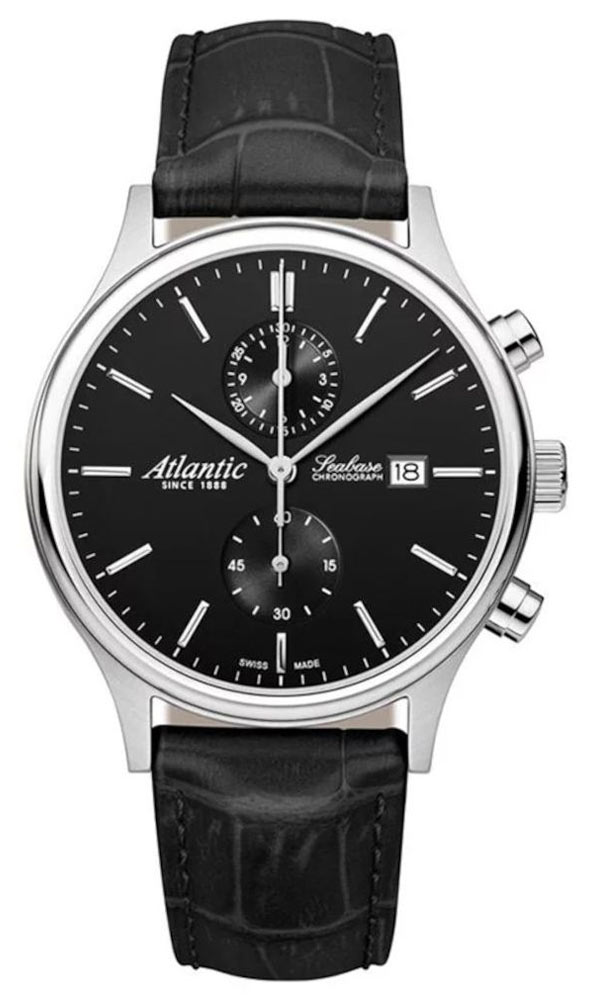 Klasyczny zegarek-chronograf męski Atlantic Seabase Chronograph. Składany ręcznie czasomierz stworzony przez szwajcarską markę z tradycją od 1888 roku. Reprezentujący rozpoznawalny, atlantycki wygląd, szwajcarską jakość oraz potwierdzoną niezawodność.