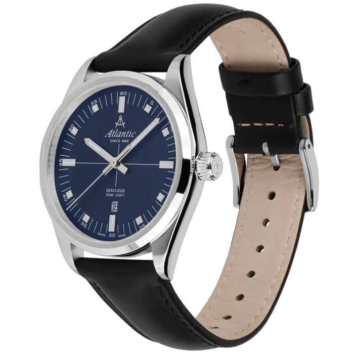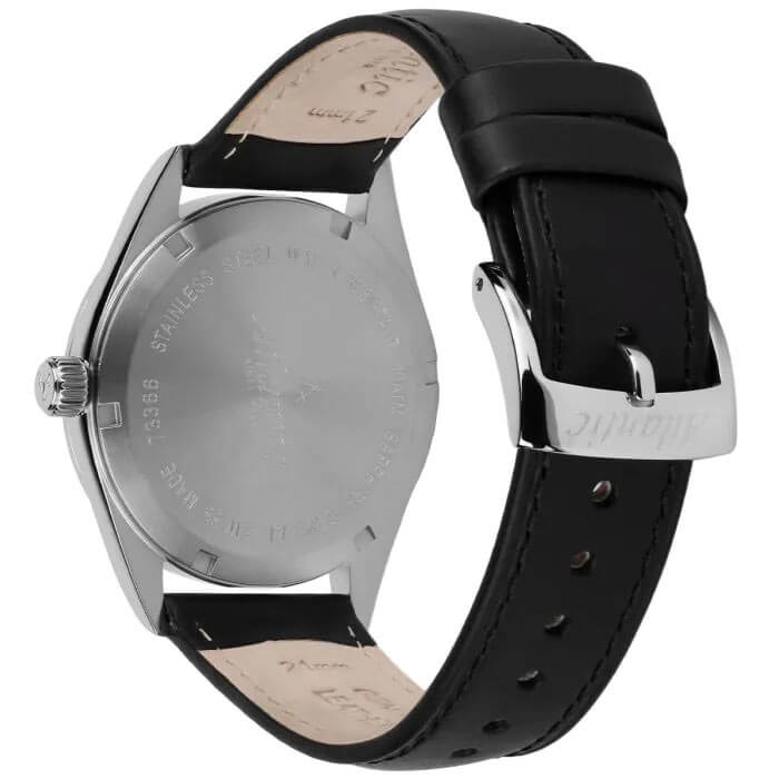 Solidna koperta o średnicy 40.5 mm, wykonana ze stali szlachetnej i wykończona subtelnym szczotkowaniem, nadaje zegarkowi elegancji i podkreśla jego trwałość. Szwajcarski zegarek męski Atlantic 733614151 wyróżnia się wysoką klasą szczelności — do 100 metrów, co czyni go odpornym na deszcz, większe zachlapania oraz przypadkowy kontakt z wodą — idealnie sprawdzi się zarówno w biurze, jak i podczas aktywnego wypoczynku. Atlantic Seacloud wyposażono w czarny skórzany pasek, który perfekcyjnie uzupełnia jego klasyczny wygląd. Pasek ten jest nie tylko elegancki, ale i bardzo wygodny – miękka skóra doskonale dopasowuje się do nadgarstka, zapewniając komfort noszenia przez cały dzień, bez względu na okazję.