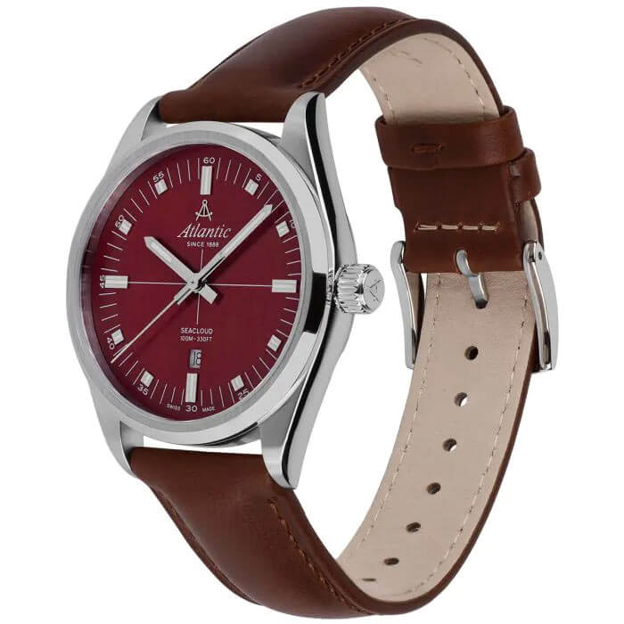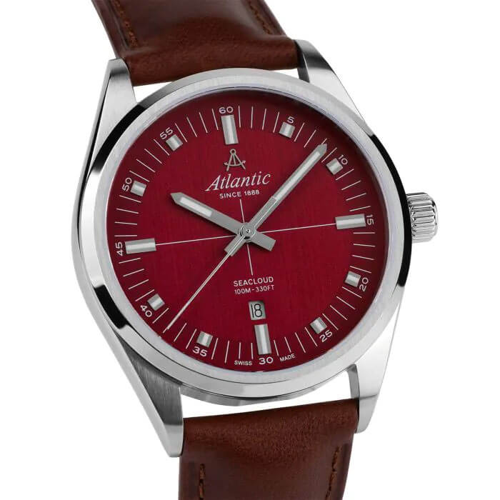 Pod odpornym na zarysowania szkłem szafirowym mieści się elegancka, czerwona tarcza, na której subtelnie połyskują indeksy oraz wyraźne wskazówki, które wypełnione są świecącą w ciemności luminescencją. To kontrastowe zestawienie nie tylko dodaje zegarkowi wyrafinowanego wyglądu, ale również zapewnia doskonałą czytelność, niezależnie od warunków. Praktyczne okienko datownika na godzinie szóstej jest niezwykle pomocne, pozwalając łatwo kontrolować bieżący dzień i lepiej planować codzienne obowiązki. Klasyczny zegarek Atlantic Seacloud 73361.41.91 napędza niezawodny, precyzyjny mechanizm szwajcarski Ronda, który gwarantuje wyjątkową dokładność – cechę, z której marka Atlantic słynie od lat.
