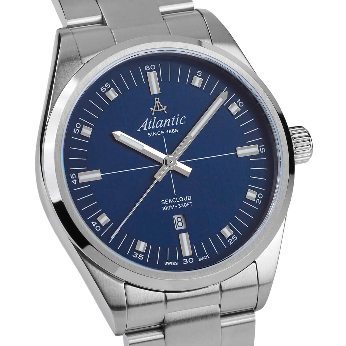 Pod odpornym na zarysowania szkłem szafirowym mieści się elegancka, niebieska tarcza, na której subtelnie połyskują indeksy oraz wyraźne wskazówki, które wypełnione są świecącą w ciemności luminescencją. To kontrastowe zestawienie nie tylko dodaje zegarkowi wyrafinowanego wyglądu, ale również zapewnia doskonałą czytelność, niezależnie od warunków. Praktyczne okienko datownika na godzinie szóstej jest niezwykle pomocne, pozwalając łatwo kontrolować bieżący dzień i lepiej planować codzienne obowiązki. Klasyczny zegarek Atlantic Seacloud 73366.41.51 na bransolecie napędza niezawodny, precyzyjny mechanizm szwajcarski Ronda, który gwarantuje wyjątkową dokładność – cechę, z której marka Atlantic słynie od lat.