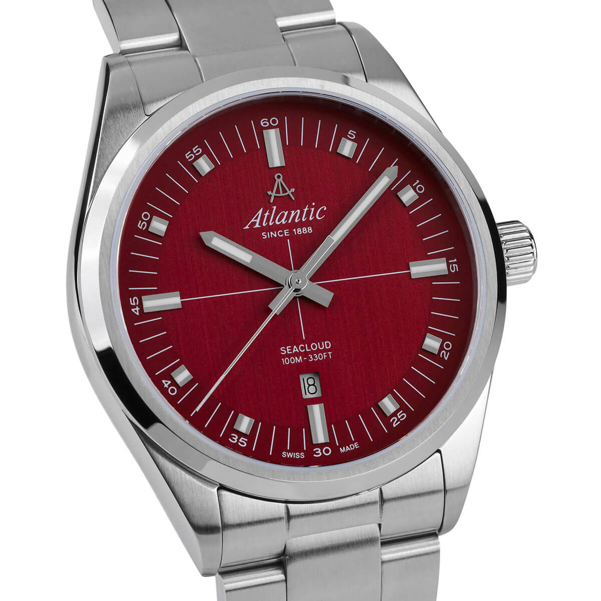 Pod odpornym na zarysowania szkłem szafirowym mieści się elegancka, czerwona tarcza, na której subtelnie połyskują indeksy oraz wyraźne wskazówki, które wypełnione są świecącą w ciemności luminescencją. To kontrastowe zestawienie nie tylko dodaje zegarkowi wyrafinowanego wyglądu, ale również zapewnia doskonałą czytelność, niezależnie od warunków. Praktyczne okienko datownika na godzinie szóstej jest niezwykle pomocne, pozwalając łatwo kontrolować bieżący dzień i lepiej planować codzienne obowiązki. Klasyczny zegarek Atlantic Seacloud 73366.41.91 na bransolecie napędza niezawodny, precyzyjny mechanizm szwajcarski Ronda, który gwarantuje wyjątkową dokładność – cechę, z której marka Atlantic słynie od lat.