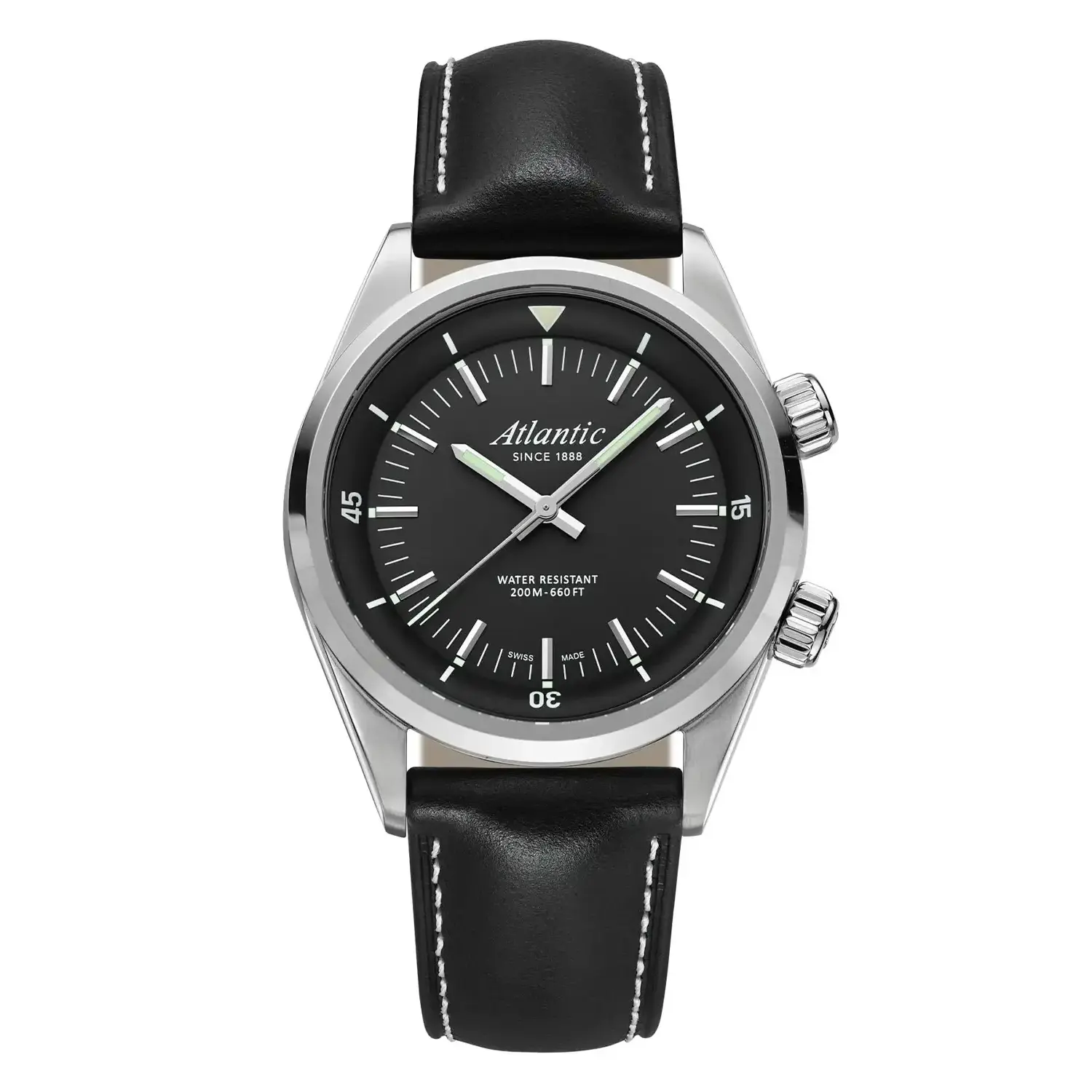 Nurkowy zegarek męski Atlantic Seacloud 73370.41.61 to szwajcarski model diver dla osób ceniących styl zakorzeniony w klasyce, ale z praktycznym zacięciem technicznym. Koperta ze stali szlachetnej o średnicy 40.5 mm oraz skórzany pasek z białym przeszyciem budują spójny, ponadczasowy charakter, który równie dobrze prezentuje się z marynarką, jak i casualowym ubiorem.