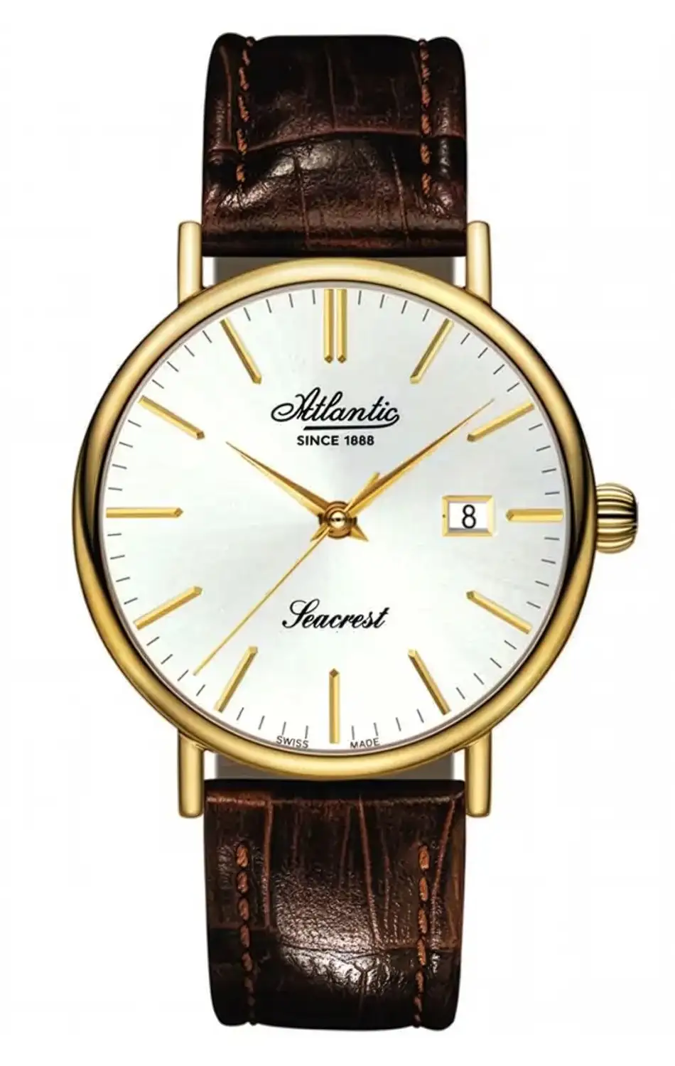Atlantic Seacrest 50354.45.21 - klasyczny zegarek męski o ponadczasowej estetyce, zaprojektowany z myślą o codziennym użytkowaniu w eleganckim stylu. Pozłacana koperta o średnicy 42 mm prezentuje się lekko i nowocześnie mimo klasycznych proporcji, a zestawienie jej z brązowym paskiem ze skóry naturalnej tworzy uniwersalną kompozycję, która sprawdzi się zarówno w pracy, jak i podczas formalnych okazji.