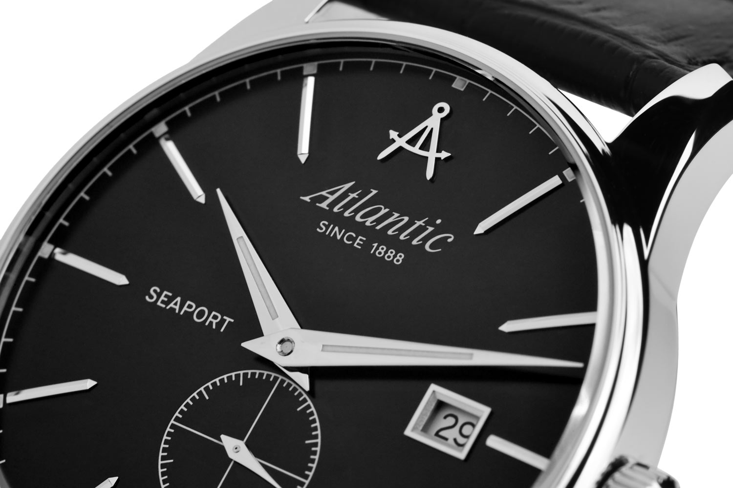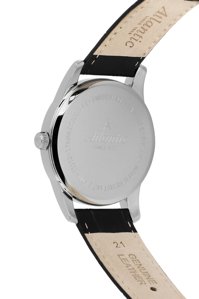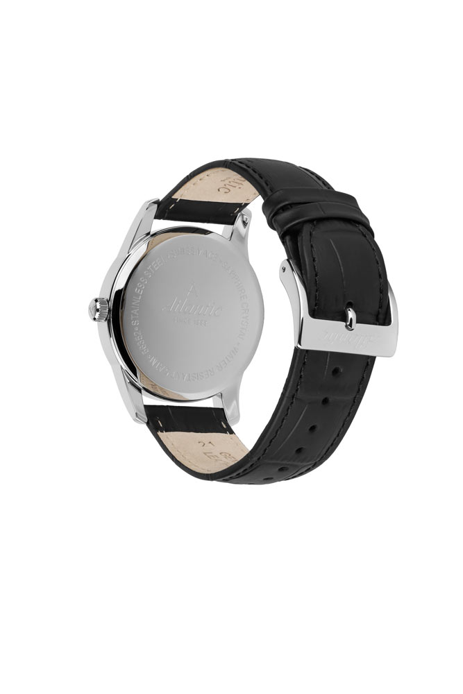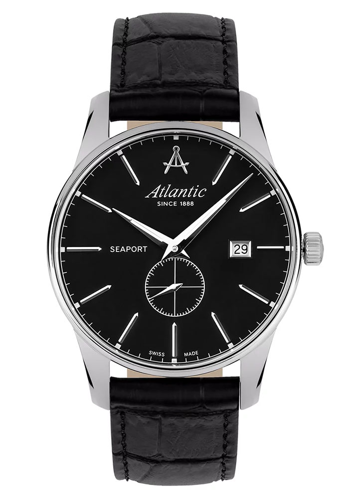 Front to wyraźnie smukły bezel, który skutecznie powiększa obszar tarczy. Szkło szafirowe, odporne na zarysowania, chroni czarną tarczę, która wyróżnia się minimalizmem i klarownością odczytu. Na tarczy nałożone zostały smukłe i ostre wskazówki oraz długie stalowe indeksy. Godzina szósta zarezerwowana została dla subtarczy sekundnika. Na godzinie dwunastej znalazło się logo marki Atlantic, które przypomina cyrkiel nawigatora statku. Funkcjonalność wzbogaca datownik, który na godzinie trzeciej wskazuje aktualny dzień miesiąca. Zegarek Atlantic na skórzanym pasku napędzany jest przez mechanizm szwajcarski Ronda. Czasomierz Atlantic z kolekcji Seaport będzie doskonałym wyborem dla fana żeglarstwa. Zegarek ten będzie dobrym wyborem dodatku na co dzień, jak i na wyjątkowe okazje.