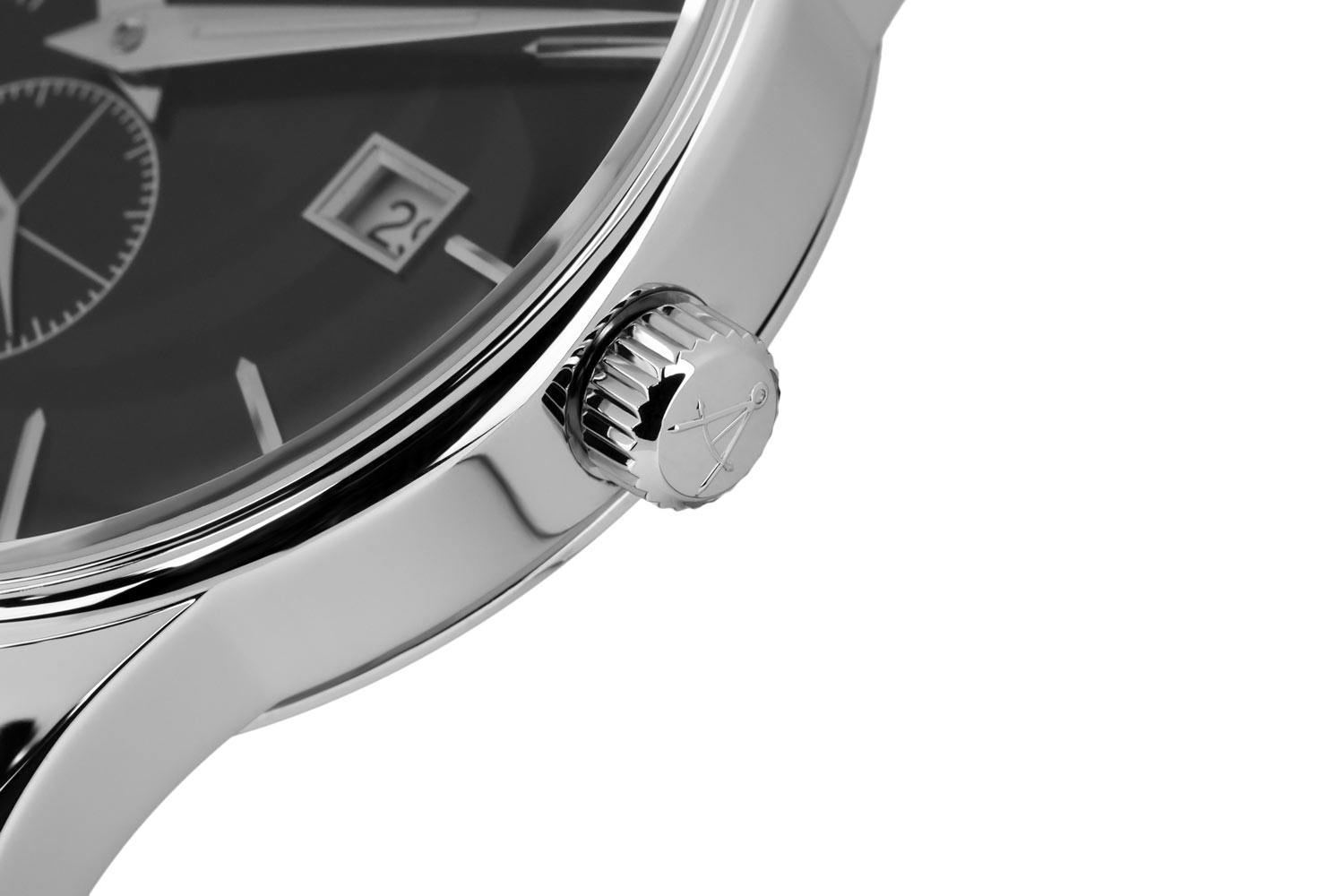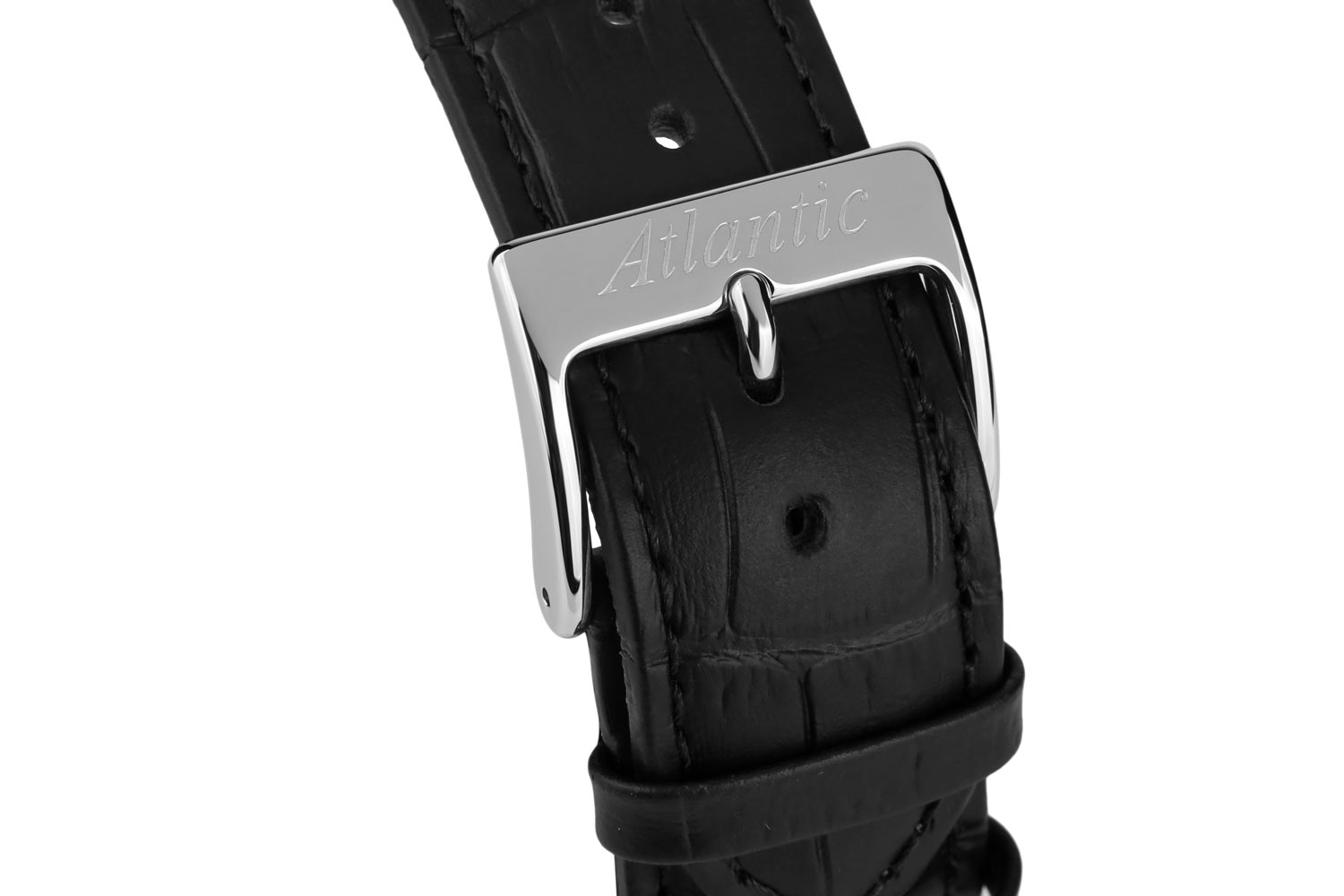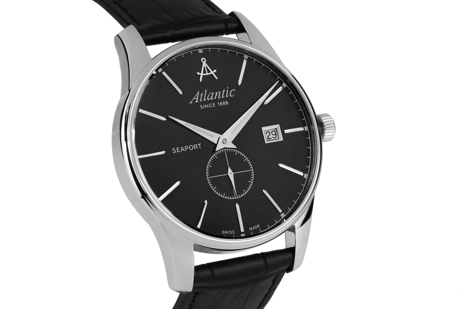 Front to wyraźnie smukły bezel, który skutecznie powiększa obszar tarczy. Szkło szafirowe, odporne na zarysowania, chroni czarną tarczę, która wyróżnia się minimalizmem i klarownością odczytu. Na tarczy nałożone zostały smukłe i ostre wskazówki oraz długie stalowe indeksy. Godzina szósta zarezerwowana została dla subtarczy sekundnika. Na godzinie dwunastej znalazło się logo marki Atlantic, które przypomina cyrkiel nawigatora statku. Funkcjonalność wzbogaca datownik, który na godzinie trzeciej wskazuje aktualny dzień miesiąca. Zegarek Atlantic na skórzanym pasku napędzany jest przez mechanizm szwajcarski Ronda. Czasomierz Atlantic z kolekcji Seaport będzie doskonałym wyborem dla fana żeglarstwa. Zegarek ten będzie dobrym wyborem dodatku na co dzień, jak i na wyjątkowe okazje.