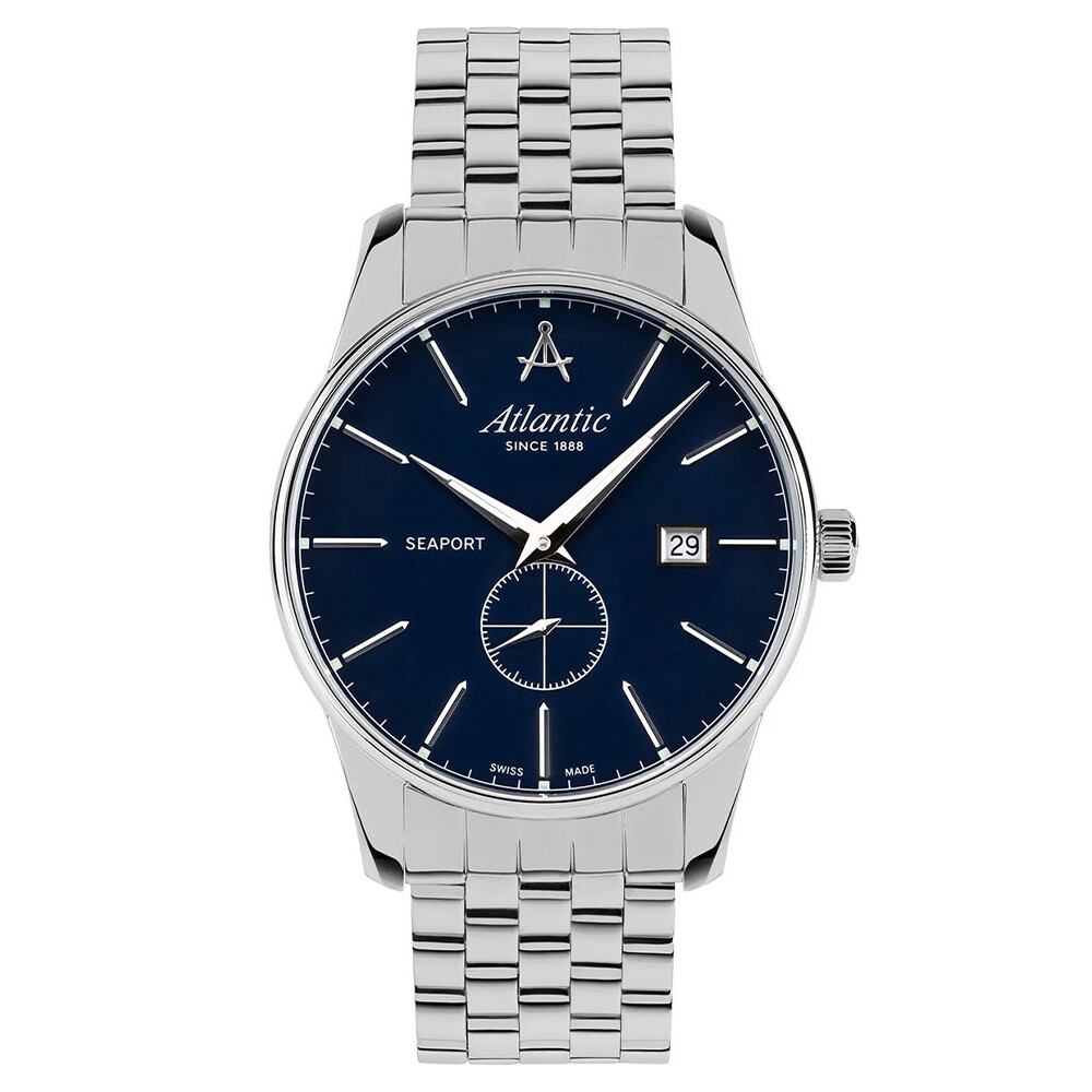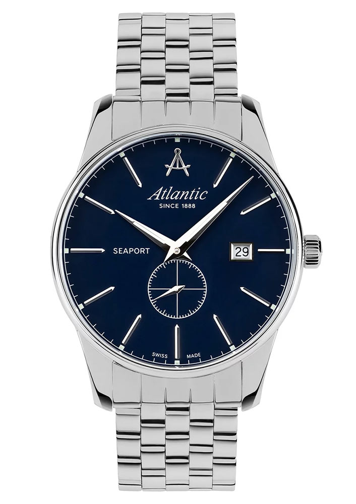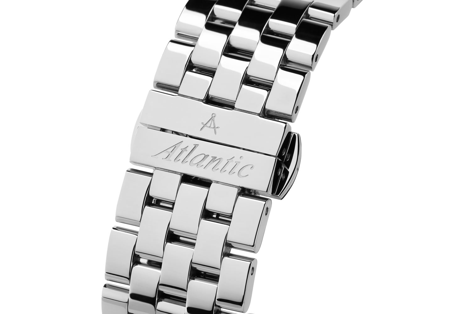 Front to wyraźnie smukły bezel, który skutecznie powiększa obszar tarczy. Szkło szafirowe, odporne na zarysowania, chroni niebieską tarczę, która wyróżnia się minimalizmem i klarownością odczytu. Na tarczy nałożone zostały smukłe i ostre wskazówki oraz długie stalowe indeksy. Godzina szósta zarezerwowana została dla subtarczy sekundnika. Na godzinie dwunastej znalazło się logo marki Atlantic, które przypomina cyrkiel nawigatora statku. Funkcjonalność wzbogaca datownik, który na godzinie trzeciej wskazuje aktualny dzień miesiąca. Czasomierz Atlantic z kolekcji Seaport będzie doskonałym wyborem dla fana żeglarstwa. Zegarek ten będzie dobrym wyborem dodatku na co dzień, jak i na wyjątkowe okazje.