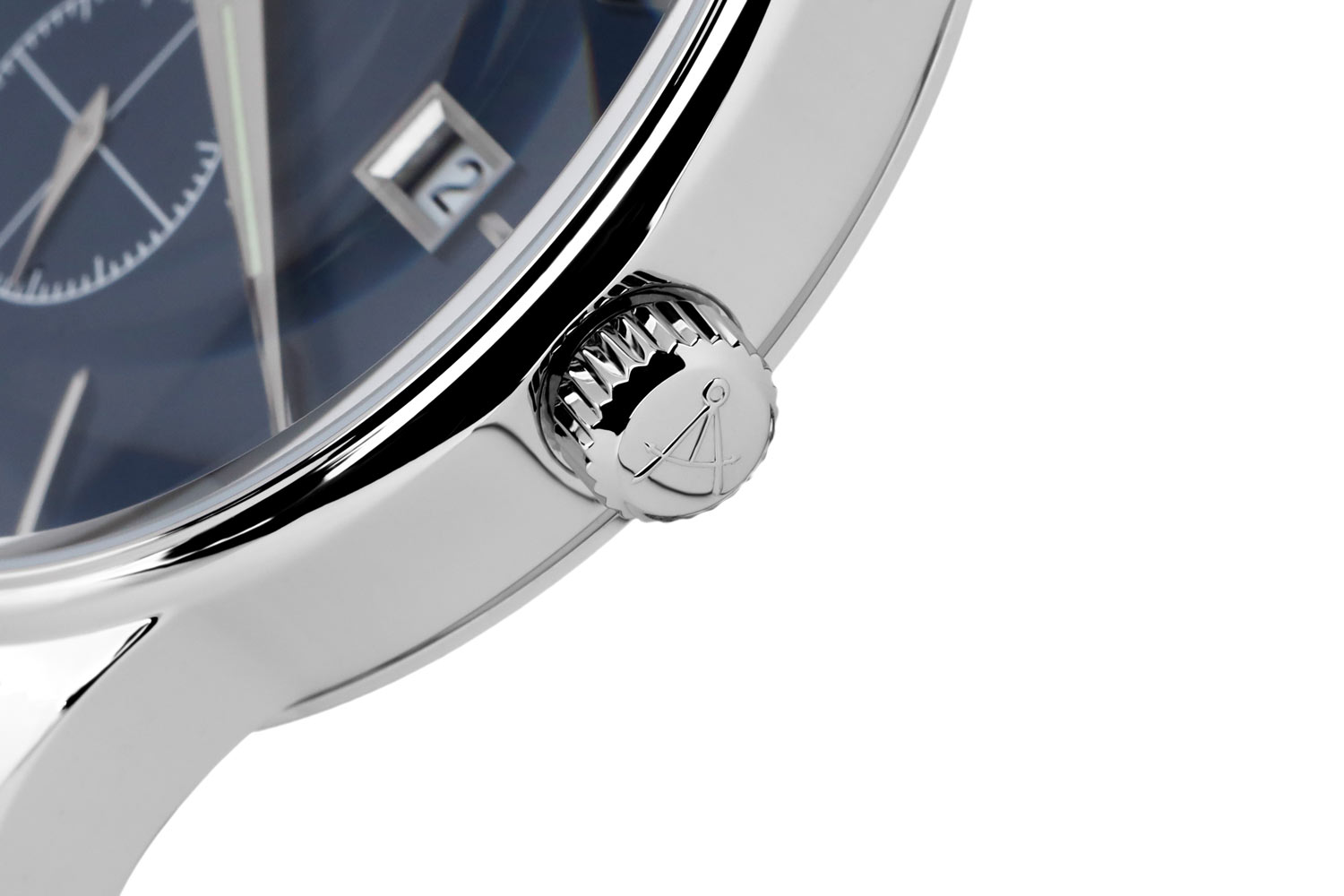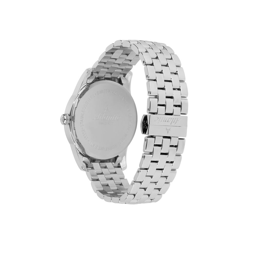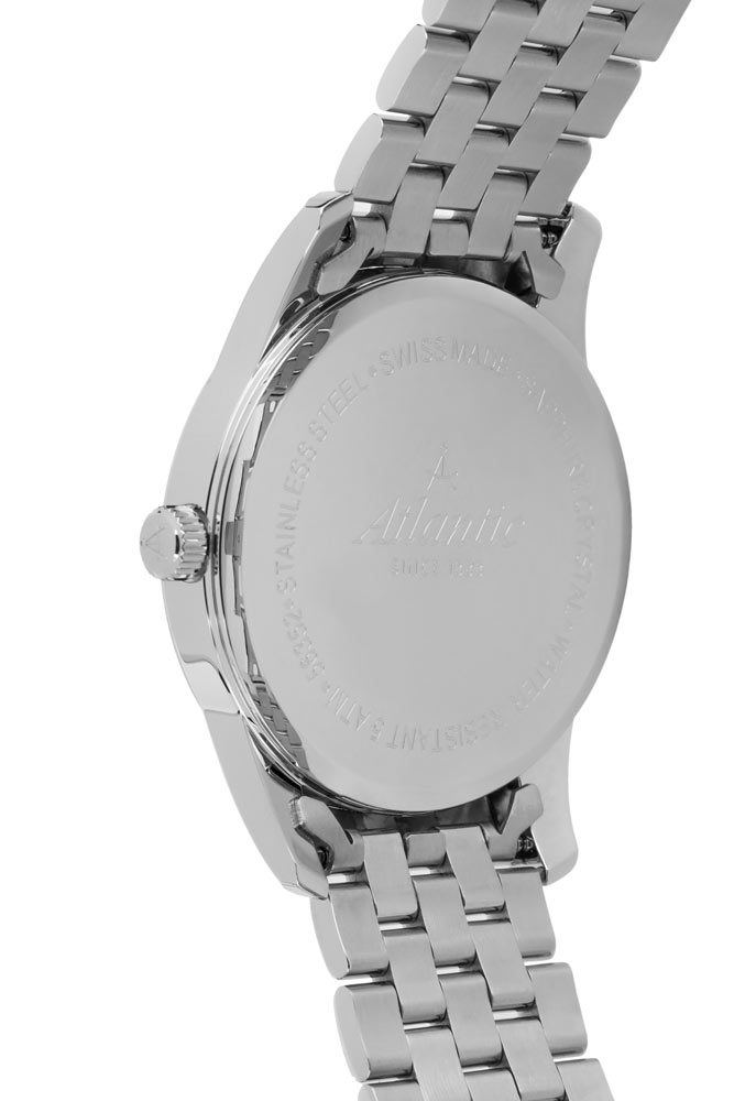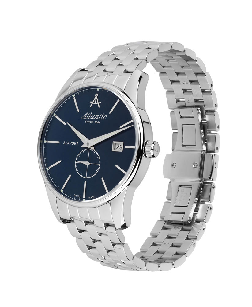 Front to wyraźnie smukły bezel, który skutecznie powiększa obszar tarczy. Szkło szafirowe, odporne na zarysowania, chroni niebieską tarczę, która wyróżnia się minimalizmem i klarownością odczytu. Na tarczy nałożone zostały smukłe i ostre wskazówki oraz długie stalowe indeksy. Godzina szósta zarezerwowana została dla subtarczy sekundnika. Na godzinie dwunastej znalazło się logo marki Atlantic, które przypomina cyrkiel nawigatora statku. Funkcjonalność wzbogaca datownik, który na godzinie trzeciej wskazuje aktualny dzień miesiąca. Czasomierz Atlantic z kolekcji Seaport będzie doskonałym wyborem dla fana żeglarstwa. Zegarek ten będzie dobrym wyborem dodatku na co dzień, jak i na wyjątkowe okazje.