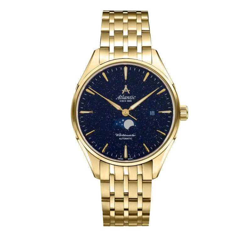 Męski zegarek automatyczny Atlantic Worldmaster Nightsky Moonphase 52788.45.91 to elegancki model dla mężczyzny, który od czasomierza oczekuje nie tylko doskonałej precyzji, ale też niebanalnej estetyki. Szwajcarski mechanizm, pozłacana koperta i tarcza inspirowana nocnym niebem tworzą kompozycję, która przemawia do osób ceniących wysmakowane detale, symbolikę i nowoczesną formę klasyki. To zegarek, który z równą pewnością odnajdzie się w wieczorowym świetle jak i w świetle dnia — na spotkaniu, w teatrze, podczas ważnego wyjścia.