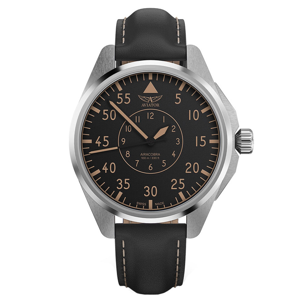 Zegarek Aviator Airacobra 43 Heritage V33903414 składa się z okrągłej obudowy ze stali szlachetnej w kolorze srebrnym. Koperta w rozmiarze 42.80 mm jest wodoszczelna do głębokości 100 metrów. Z zegarkiem można pływać bez obawy o jego uszkodzenie — stalowy, zakręcany dekiel dba o spójność całej konstrukcji. Po prawej stronie umiejscowiona została wygodna w obsłudze koronka do manipulacji wskazówkami. Producent swój lotniczy czasomierz zestawił z paskiem skórzanym w kolorze czarnym z tradycyjnym zapięciem na klamerkę z igłą.