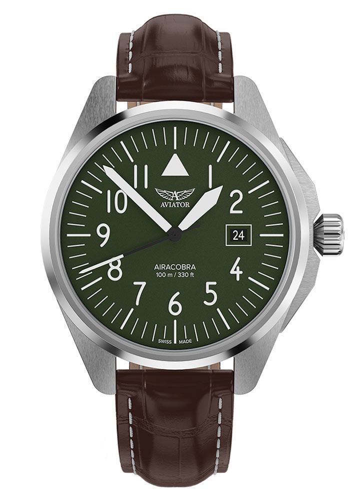 Zegarek Aviator Airacobra 43 quartz prezentuje zieloną tarczę w stylu lotniczym. Wskazówki i indeksy pokryte szwajcarską luminescencją Super-LumiNova® gwarantują doskonałą czytelność o każdej porze dnia i nocy. Datownik umieszczony na godzinie trzeciej ułatwia śledzenie aktualnej daty, podkreślając jednocześnie funkcjonalność tego modelu. Całość chroniona jest przez odporne na zarysowania szkło szafirowe, wyposażone dodatkowo w powłokę antyrefleksyjną, co zapewnia klarowność odczytu nawet w trudnych warunkach oświetleniowych.