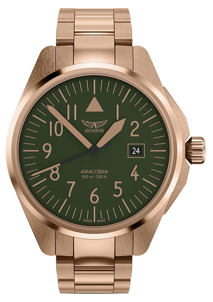 Pozłacany zegarek Aviator Airacobra 43 Type A V.1.38.2.330.5 na bransolecie wyróżnia się nie tylko swoją solidną konstrukcją, lecz także niezawodnością i precyzją działania, co charakteryzuje już każdy model szwajcarskiej marki Aviator. Koperta o średnicy 42.80 mm, wykonana ze stali szlachetnej, prezentuje elegancki odcień koloru różowo-złotego PVD, zapewniając nie tylko estetykę, lecz także odporność na działanie czynników zewnętrznych. Ergonomiczna koronka umożliwia wygodne ustawianie czasu, dodając jednocześnie charakterystyczny element do lotniczego designu. Zakręcany dekiel zamykający rewers zegarka zapewnia wodoszczelność do głębokości 100 metrów, co czyni go niezastąpionym towarzyszem w codziennych aktywnościach.