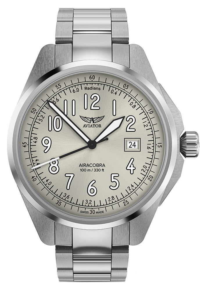 Zegarek Aviator Airacobra 43 Type B V13803275 to kwintesencja funkcjonalności i stylu, co widać w każdym szczególe. Srebrny cyferblat w stylu lotniczym ze skalą radianową dodaje charakteru, podczas gdy wskazówki i indeksy pokryte białą luminescencją Super-LumiNova® swiss made gwarantują czytelność o każdej porze. Skala radianowa na tarczy ze szlifem słonecznym może być przydatna do pomiaru czasu w jednostkach kątowych. Datownik na godzinie trzeciej ułatwia śledzenie daty, dodając funkcjonalności. Całość osłania odporne na zarysowania szkło szafirowe z powłoką antyrefleksyjną, zapewniając czytelność nawet w trudnych warunkach oświetleniowych.