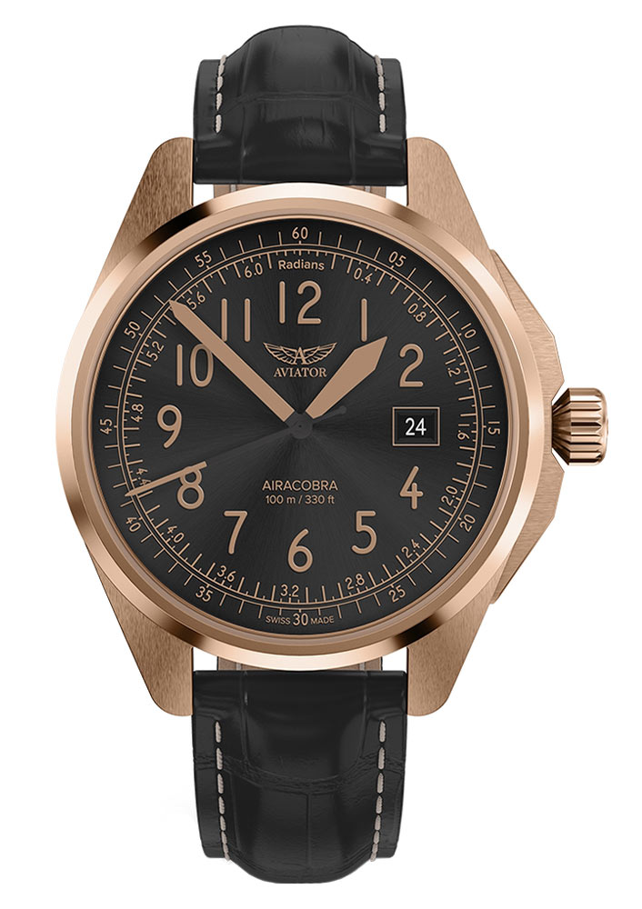 Zegarek Aviator Airacobra 43 Type B V13823234 to kwintesencja funkcjonalności i stylu, co widać w każdym szczególe. Czarny cyferblat w stylu lotniczym ze skalą radianową dodaje charakteru, podczas gdy wskazówki i indeksy pokryte luminescencją Super-LumiNova® swiss made gwarantują czytelność o każdej porze. Skala radianowa na tarczy ze szlifem słonecznym może być przydatna do pomiaru czasu w jednostkach kątowych. Datownik na godzinie trzeciej ułatwia śledzenie daty, dodając funkcjonalności. Całość osłania odporne na zarysowania szkło szafirowe z powłoką antyrefleksyjną, zapewniając klarowność nawet w trudnych warunkach oświetleniowych.