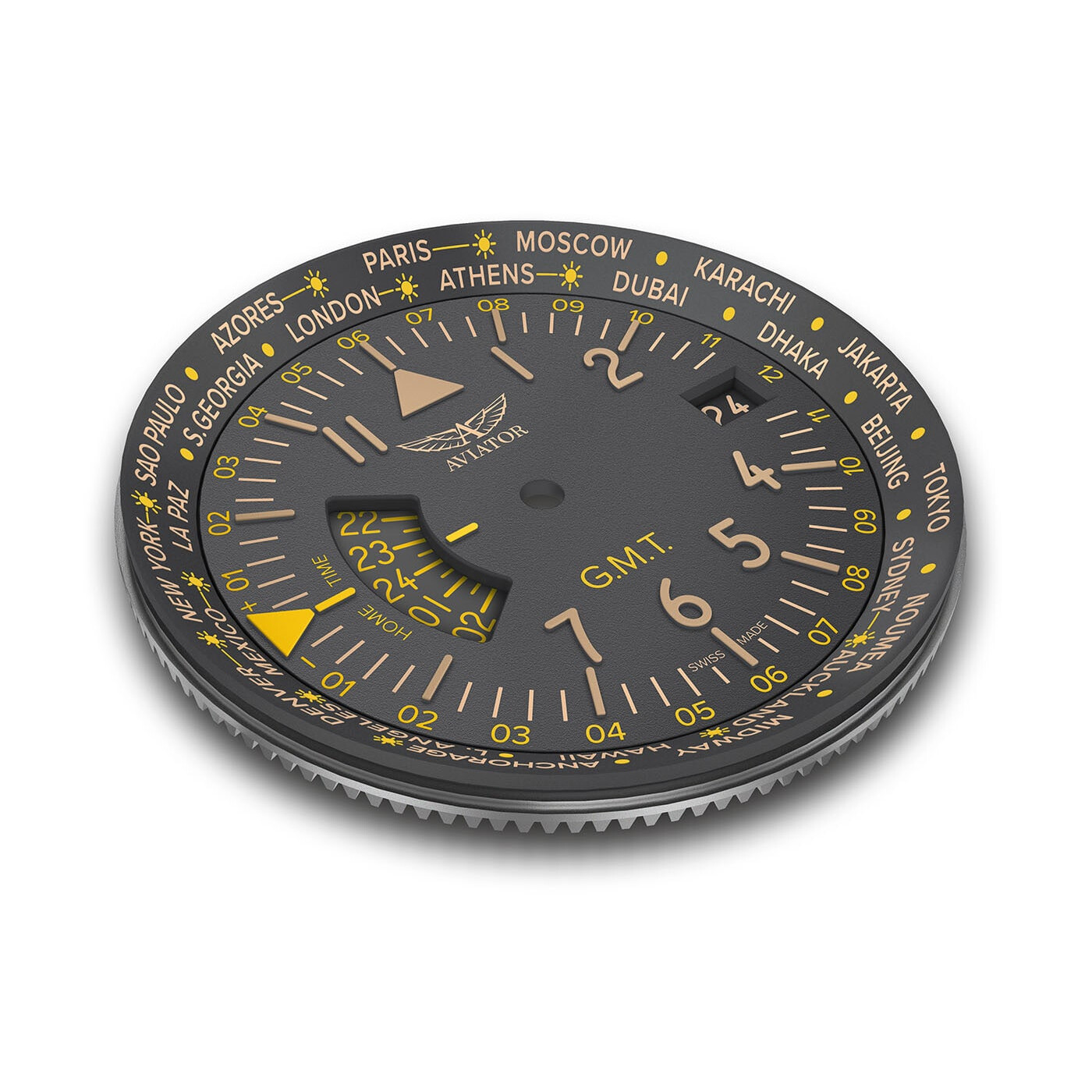 Pod trudnym do zarysowania szkłem szafirowym z antyrefleksem znajduje się bogaty w funkcje szary cyferblat. Na zewnętrznej części tarczy znalazła się podziałka z miastami z całego świata. Zegarek posiada funkcję 24-godzinnej drugiej strefy czasowej oraz funkcję czasu światowego kontrolowanego obrotowym pierścieniem. Na godzinie trzeciej znalazło się okienko datownika z aktualnym dniem miesiąca. Producent ułatwia odczytanie godziny nawet w całkowitej ciemności dzięki podświetleniu Super-LumiNova.