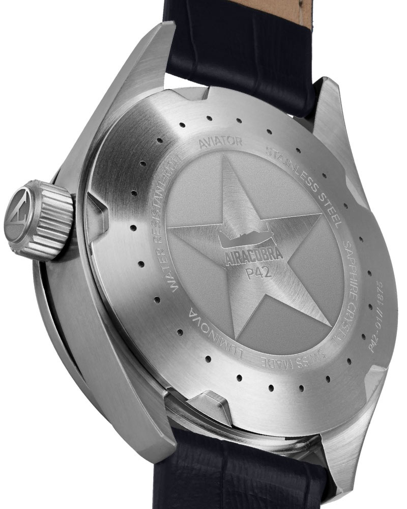 Na odwrocie zegarka znajduje się zakręcany dekiel i tak jak w przypadku koronki jest to wzmocnienie szczelności zegarka. Na deklu znajdują się subtelne opisy nawiązujące do konstrukcji kadłuba samolotu Airacobra. Dekiel ozdobiony został gwiazdą, a w jej środku znalazł się samolot, który zasługuje na kilka chwil uwagi. Myśliwiec ten to amerykański fighter Bell Airacobra P-39, którego producentem był Bell Aircraft z okresu 2 wojny światowej. Jego pierwszy lot odbył się 6 kwietnia 1938 r. i początkowo miał być samolotem eskortowym dla bombowców, ale ostatecznie producent zmienił jego rolę na myśliwiec szturmowy.