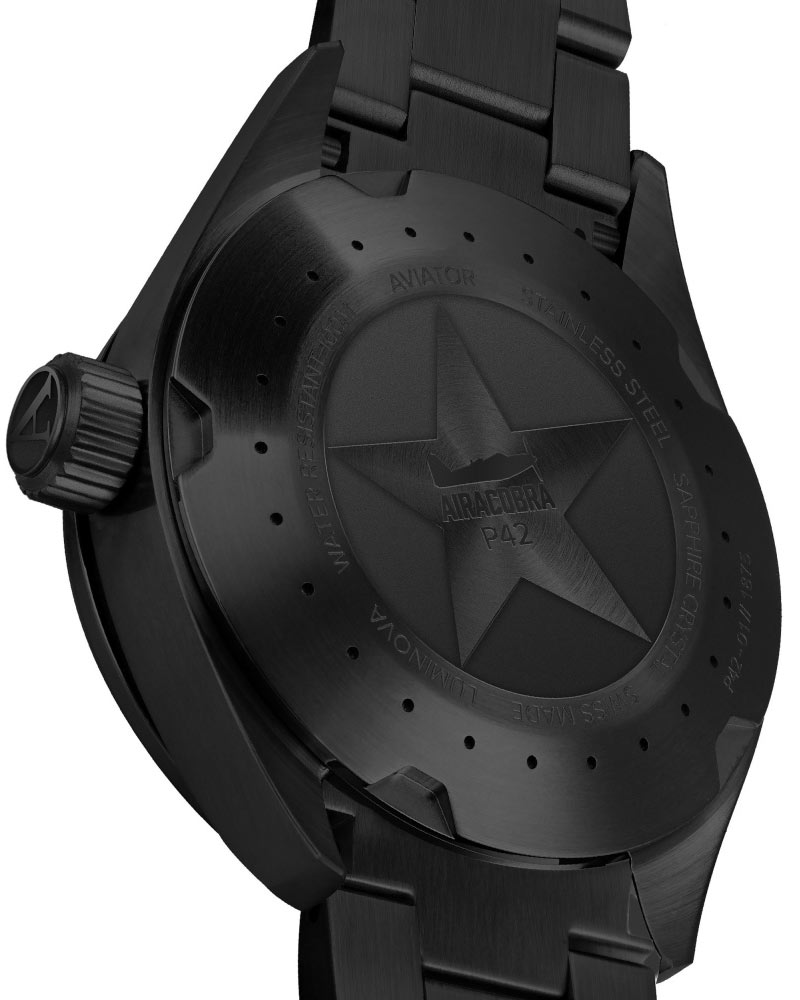 Na odwrocie zegarka znajduje się zakręcany dekiel i tak jak w przypadku koronki jest to wzmocnienie szczelności zegarka. Dekiel ozdobiony został gwiazdą, a w jej środku znalazł się samolot, który zasługuje na kilka chwil uwagi. Myśliwiec ten to amerykański fighter Bell Airacobra P-39, którego producentem był Bell Aircraft z okresu 2 wojny światowej. Jego pierwszy lot odbył się 6 kwietnia 1938 r i początkowo miał być samolotem eskortowym dla bombowców, ale ostatecznie producent zmienił jego rolę na myśliwiec szturmowy.