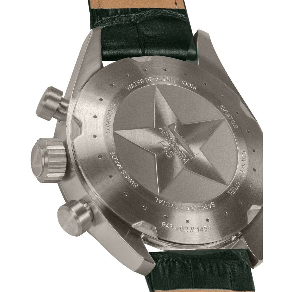 Aviator Airacobra P45 Chrono V22571714 to okrągła szczotkowana koperta ze stali nierdzewnej o wielkości 45 mm uszczelniona do 100 metrów. Na prawej stronie obudowy umieszczono zakręcaną koronkę, dużą i łatwą w obsłudze oraz przyciski funkcyjne. Do uszu przymocowany został elegancki wielokrotnie garbowany dla zwiększenia jakości zielony pasek ze skóry z egzotycznym wzorem i zapięciem na klamerkę. Zapięcie wykonana jest w taki sposób, aby nawiązywało do aerodynamicznych samolotów. Szkło szafirowe z antyrefleksem wysoce odporne na zarysowanie chroni zielony kontrastowy cyferblat z dużymi wskazówkami i cyframi arabskimi, które pokryte są świecącą lumą, co pozwala na łatwe odczytanie czasu nawet w ciemności. Na godzinie 4 producent umieścił okienko datownika z aktualnym dniem miesiąca. Zegarek wyposażony został w kilka funkcji - chronografu inaczej nazywaną stoperem, tachymetr oraz telemeter. Chronograf pozwoli odmierzyć dokładny czas na przykład okrążenia na różnego rodzaju wyścigach. Tachymetr zmierzy średnią prędkość poruszania się na odcinku jednego kilometra. Funkcja telemetr w zegarku jest zwykle używana do pomiaru odległości między użytkownikiem zegarka a zjawiskiem, które jest obserwowane i słyszane w tym samym czasie, takim jak wybuch lub piorun. Telemeter swoją skalę umieszczoną ma na bezelu zegarka. W zegarku bije kwarcowe serce zasilane baterią - Ronda 5040D to mechanizm szwajcarski i zapewni dokładne odmierzanie czasu.