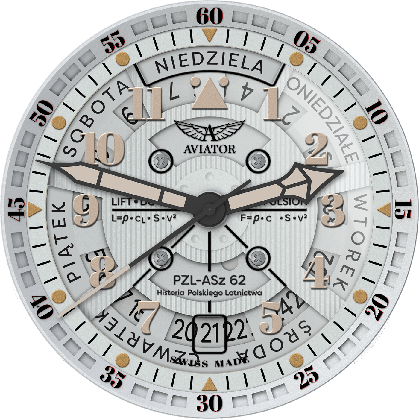 Limitowana, Polska Edycja Specjalna, zegarek z datą i dniem tygodnia po polsku Aviator Douglas Day-Date Meca-41 Polish Edition V.3.36.0.293.4 PL. Współczesny zegarek pilota o innowacyjnym designie i funkcjonalności instrumentu pilotażowego. Powstały z pasji do zegarmistrzostwa i jednocześnie z zamiłowania do lotnictwa. Upamiętnienie Historii Polskiego Lotnictwa poprzez podkreślenie silnika PZL-ASz 62 i obliczeń lotniczych na tarczy, a także orła na wahniku 3D oraz wyważnika lakierowanego na czerwono.