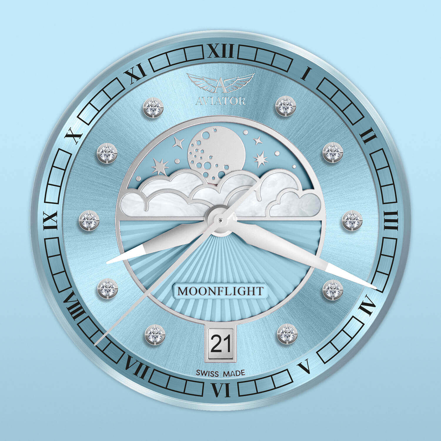 Centralną część tarczy zdobi poetycka komplikacja faz księżyca, ukryta pod subtelnymi chmurami z masy perłowej – element, który nie tylko zachwyca, ale i symbolicznie przywołuje kobiecą zmienność, tajemniczość i harmonię z cyklem natury. Migoczące odbicia i głęboka purpura tarczy tworzą spektakl światła i koloru, który przyciąga spojrzenia i zatrzymuje czas – na nadgarstku i w myślach. Zegarek Aviator pozwala śledzić 29.5-dniowy cykl księżyca, przypominając, że życie to nie tylko minuty i godziny, ale także fazy, zmiany, nastroje.