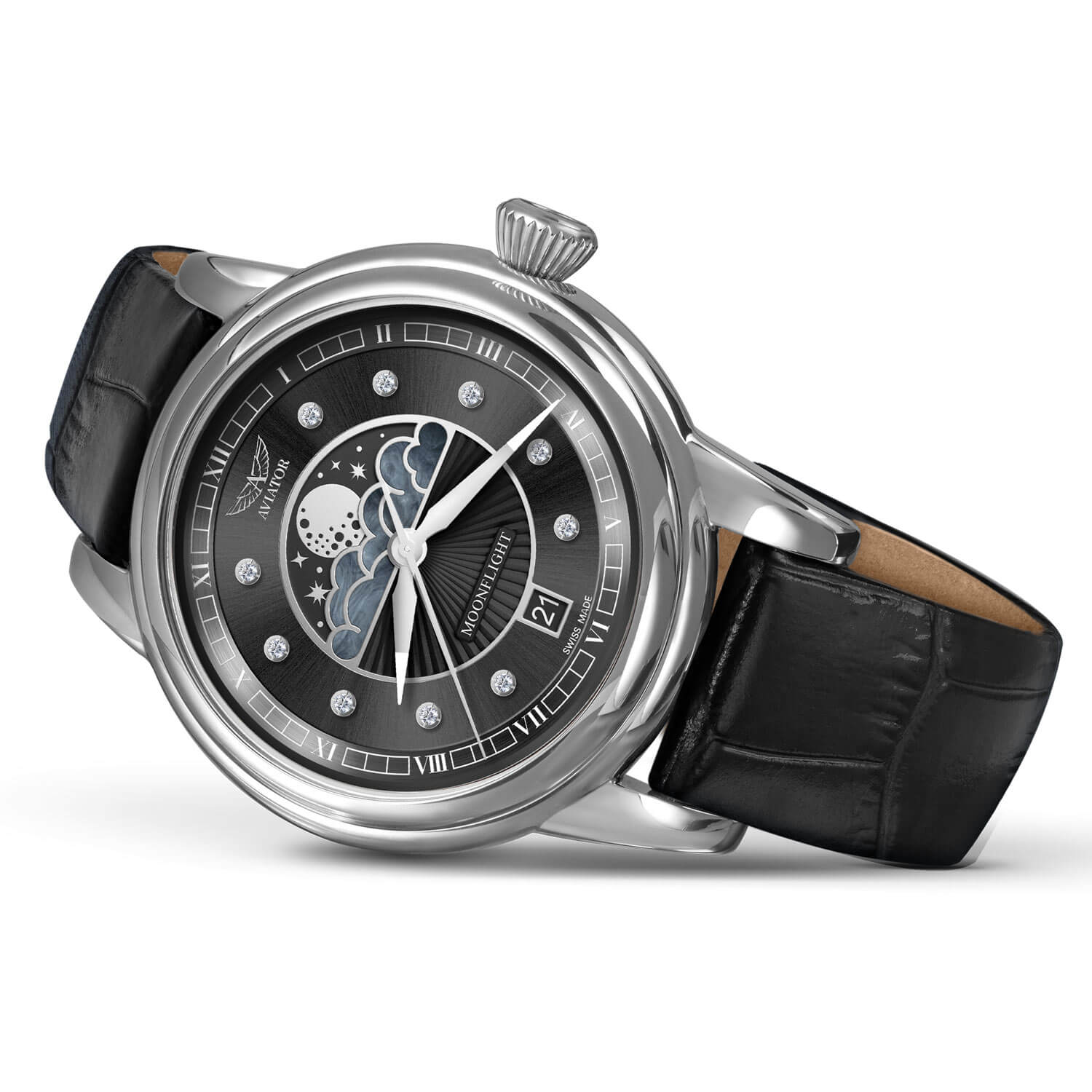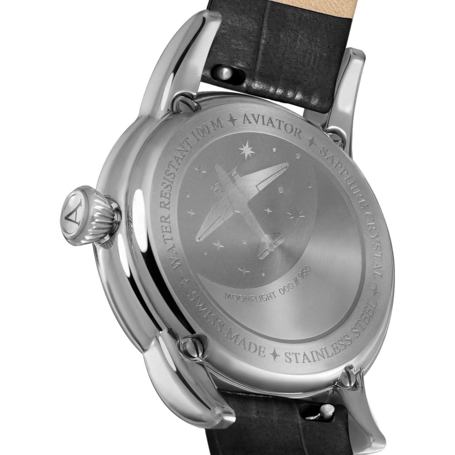 Szwajcarski zegarek Aviator Limited Edition z zewnątrz zachwyca 36-milimetrową kopertą z ręcznie polerowanymi krzywiznami i trójdzielną konstrukcją, inspirowaną kadłubem samolotu. Wygodne zakrzywione uszy koperty i wypukłe szkło tworzą harmonijną bryłę – zmysłową i aerodynamiczną, idealnie dopasowaną do kobiecego nadgarstka. Front przykryty został szkłem szafirowym z antyrefleksem, które ciężko zarysować. Na rewersie odnajdujemy wygrawerowanego Douglasa DC-3 w świetle księżyca – detal, który łączy marzenie o podróży z luksusem codziennego życia. To elegancja oparta na historii, wykończeniu i emocjach – nie na modzie sezonu. Prezentowany model zestawiony jest z miękkim i lekkim paskiem skórzanym w kolorze czarnym, który doskonale komponuje się kolorystycznie z tarczą.