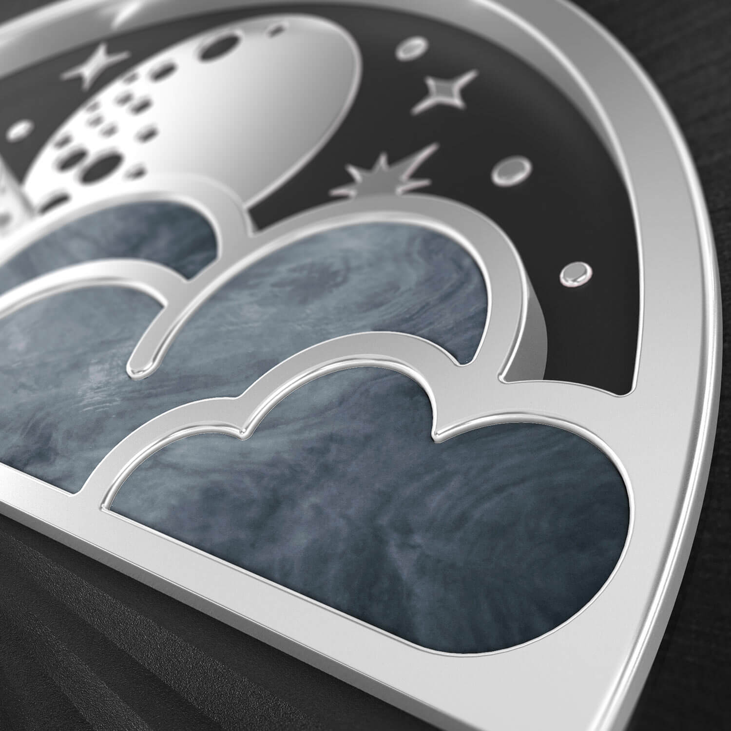 Centralną część tarczy zdobi poetycka komplikacja faz księżyca, ukryta pod subtelnymi chmurami z masy perłowej – element, który nie tylko zachwyca, ale i symbolicznie przywołuje kobiecą zmienność, tajemniczość i harmonię z cyklem natury. Migoczące odbicia i głęboka purpura tarczy tworzą spektakl światła i koloru, który przyciąga spojrzenia i zatrzymuje czas – na nadgarstku i w myślach. Zegarek Aviator pozwala śledzić 29.5-dniowy cykl księżyca, przypominając, że życie to nie tylko minuty i godziny, ale także fazy, zmiany, nastroje.