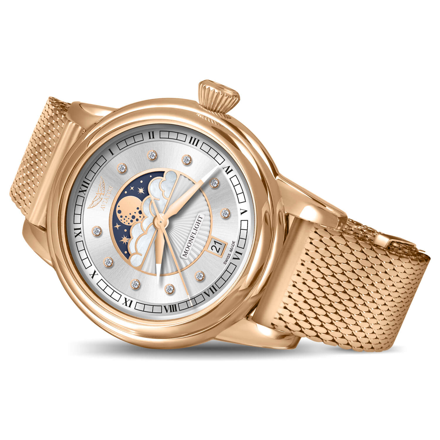 Centralną część tarczy zdobi poetycka komplikacja faz księżyca, ukryta pod subtelnymi chmurami z masy perłowej – element, który nie tylko zachwyca, ale i symbolicznie przywołuje kobiecą zmienność, tajemniczość i harmonię z cyklem natury. Migoczące odbicia i głęboka purpura tarczy tworzą spektakl światła i koloru, który przyciąga spojrzenia i zatrzymuje czas – na nadgarstku i w myślach. Zegarek Aviator pozwala śledzić 29.5-dniowy cykl księżyca, przypominając, że życie to nie tylko minuty i godziny, ale także fazy, zmiany, nastroje.