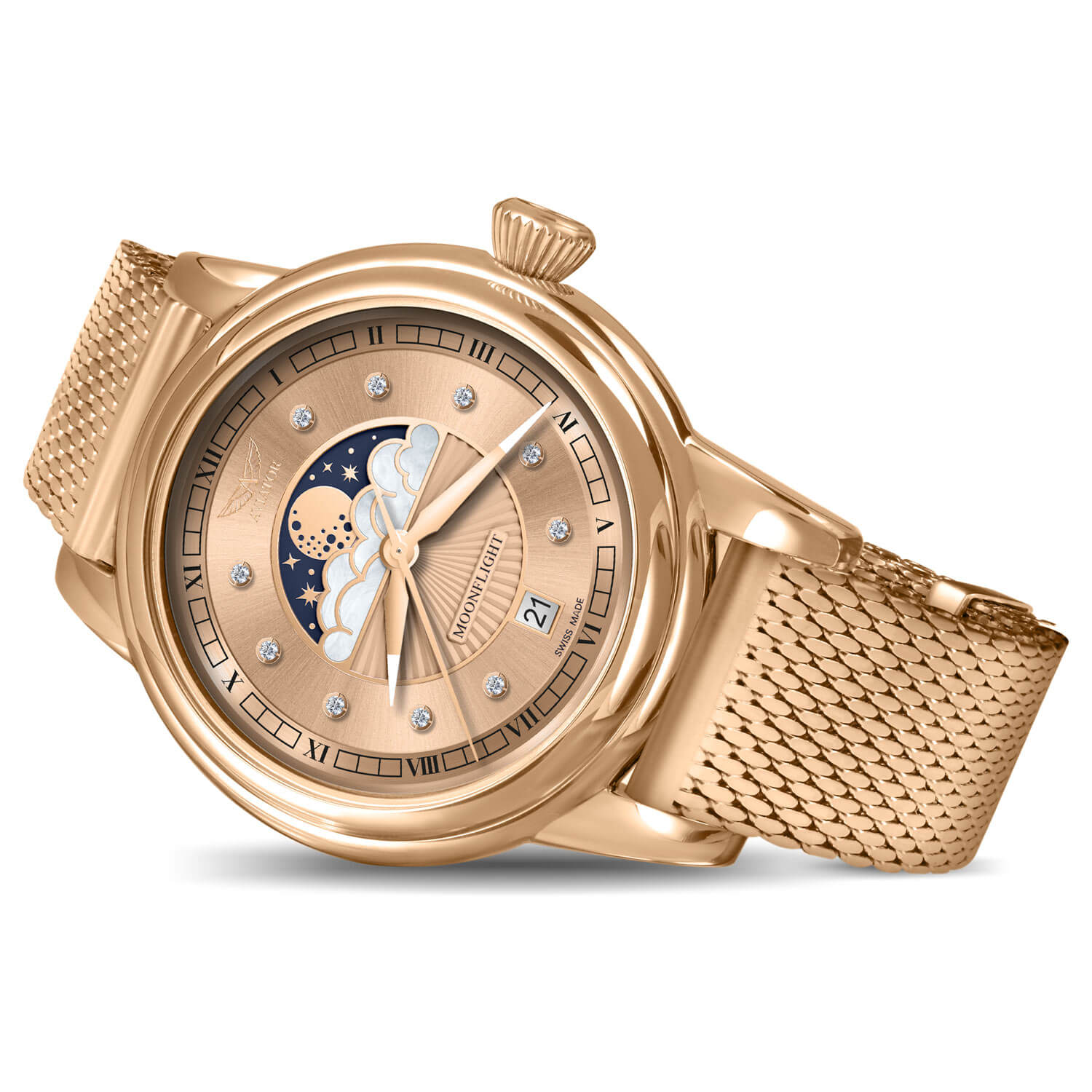 Centralną część tarczy zdobi poetycka komplikacja faz księżyca, ukryta pod subtelnymi chmurami z masy perłowej – element, który nie tylko zachwyca, ale i symbolicznie przywołuje kobiecą zmienność, tajemniczość i harmonię z cyklem natury. Migoczące odbicia i głęboka purpura tarczy tworzą spektakl światła i koloru, który przyciąga spojrzenia i zatrzymuje czas – na nadgarstku i w myślach. Zegarek Aviator pozwala śledzić 29.5-dniowy cykl księżyca, przypominając, że życie to nie tylko minuty i godziny, ale także fazy, zmiany, nastroje.