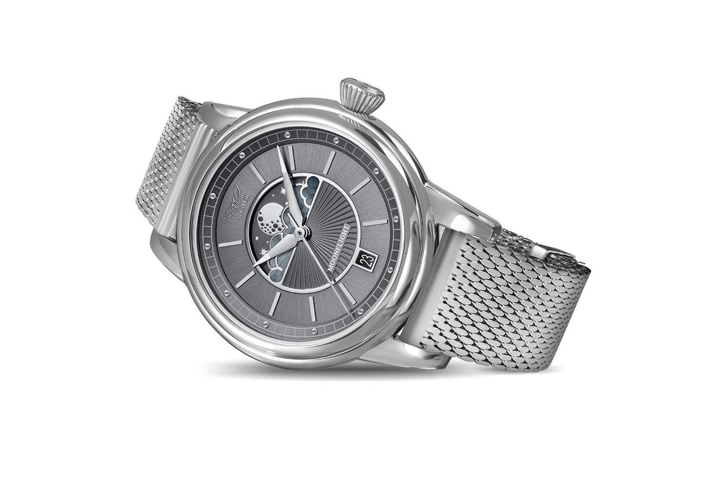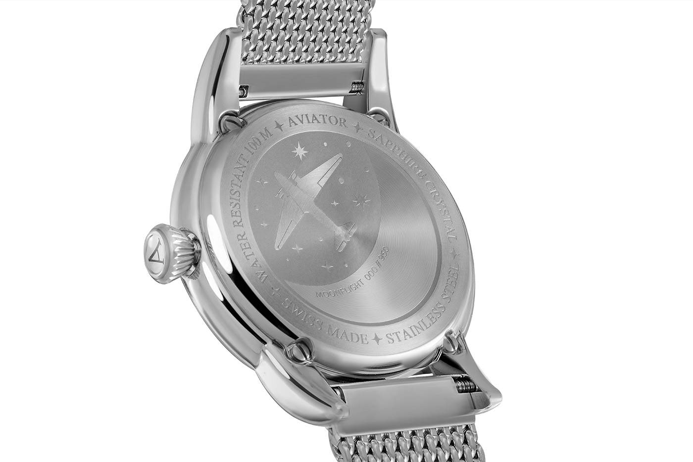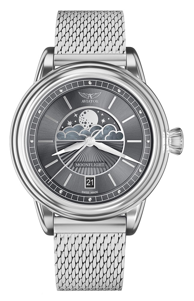 Niezwykle twarde i odporne na zarysowania szkło szafirowe z antyrefleksem chroni tarczę z subtelnymi stalowymi indeksami i wskazówkami. Te drugie wyposażone zostały w materiał luminescencyjny, który pomoże odczytać aktualną godzinę w ciemności. Tarcza ozdobiona została giloszem w postaci promieni słońca i wyposażona w subtarczę funkcji faz księżyca. Wyjątkowa tarcza typu moon-phase to chmury osadzone w postaci niepowtarzalnej masy perłowej w ramce, gwieździste niebo i błyszczący księżyc w jego wszystkich fazach. Funkcja fazy księżyca to nie tylko przepiękna dla kobiecego oka ozdoba, ale i przydatna mechanika obserwowania księżyca bez wyglądania za okno. Cała tarcza zaprojektowana została z trójwymiarowym postrzeganiem głębi. Pod nią mieści się wysoce precyzyjny mechanizm szwajcarski na baterię. Poza odmierzaniem czasu dostarcza on danych o fazach księżyca i dacie, która znalazła swoje miejsce na godzinie 6. Ten srebrny czasomierz damski Aviator na bransolecie mesh będzie idealnym partnerem dla torebek, eleganckich kostiumów i dodatków biżuteryjnych.